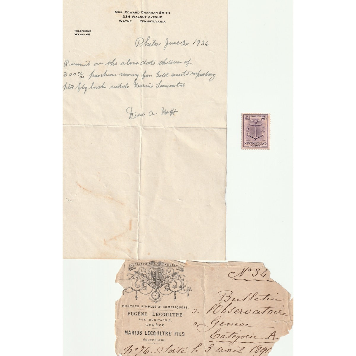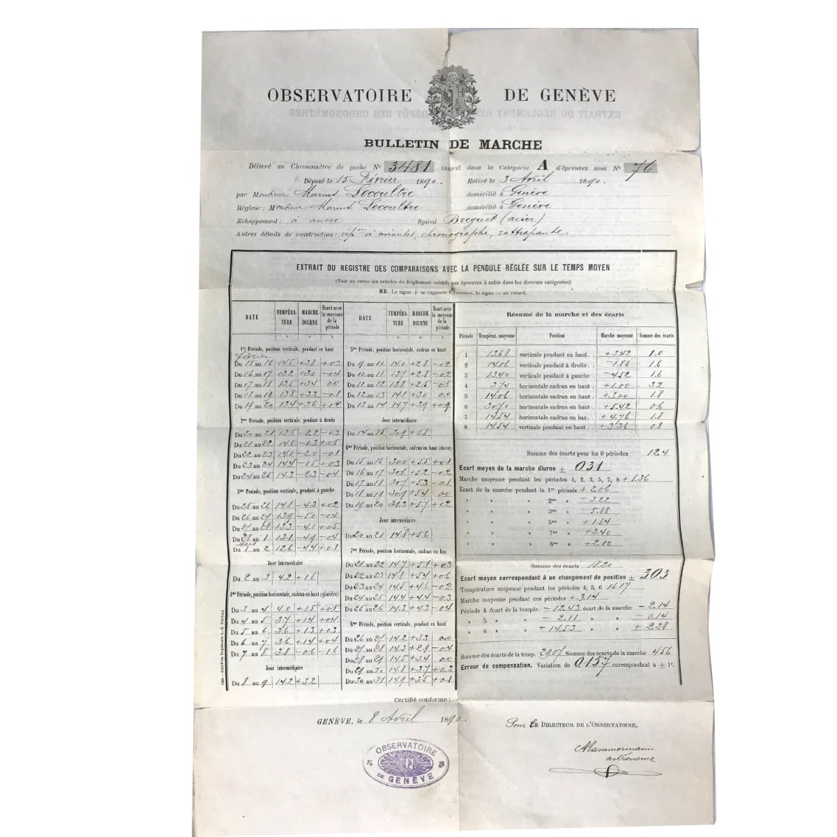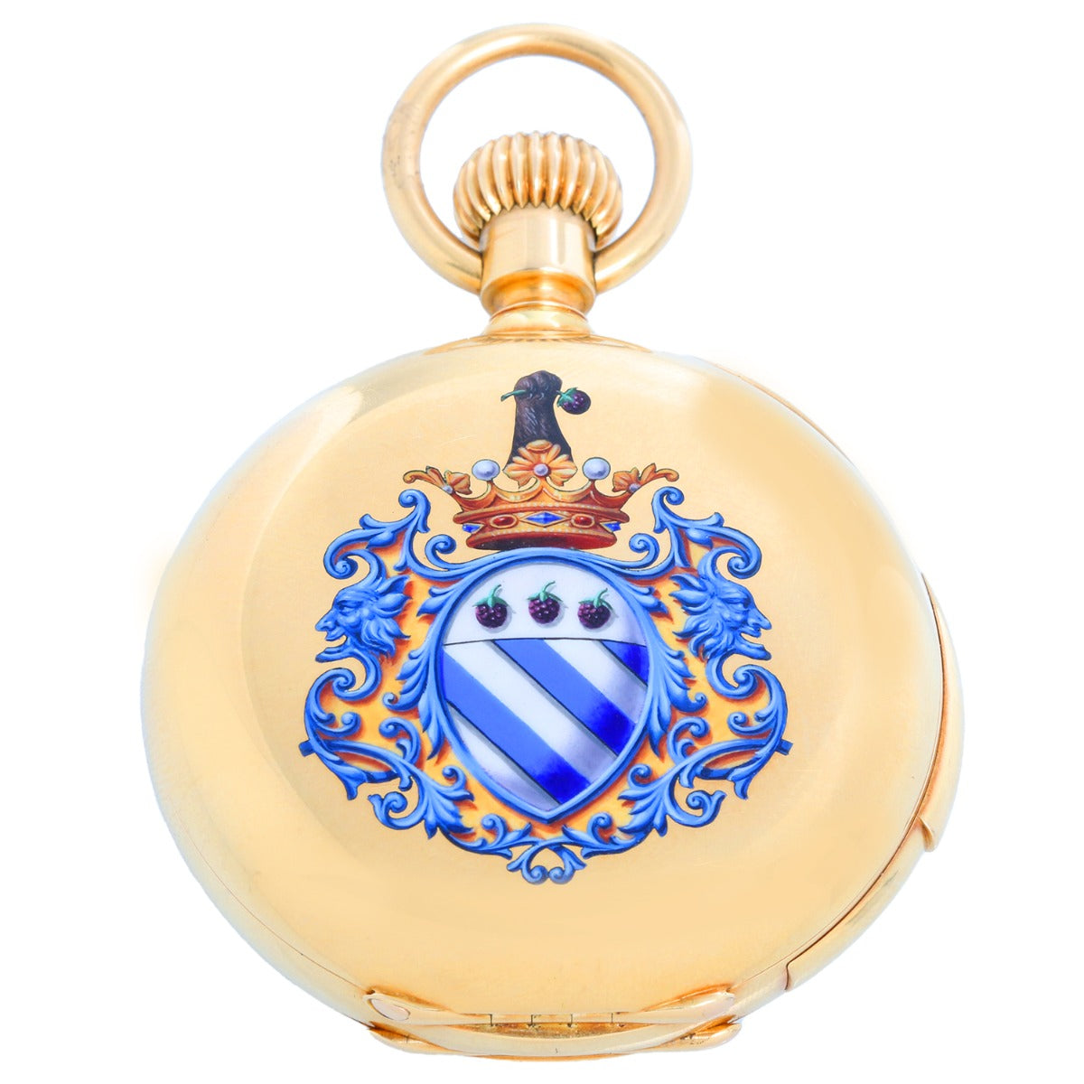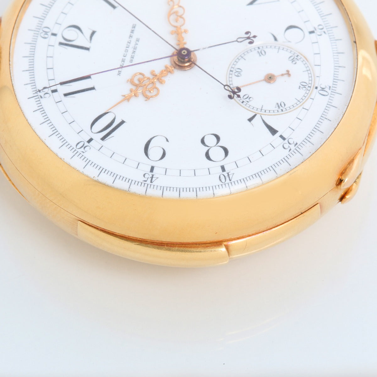 Marius Lecoultre Very Fine Gold Minute Repeater With Split Second Chronograph - Manual winding. Heavy 18k yellow gold ( 53 mm ) four body, gold cuvette, case back with high quality Multicolor enameled coat-of-arms. White enamel, radial Arabic numerals, outer 1/5th second divisions. Signed Marius Lecoultre Rue Bonivard 8, Geneve. Geneva Observatory Timing Papers and Original Box .