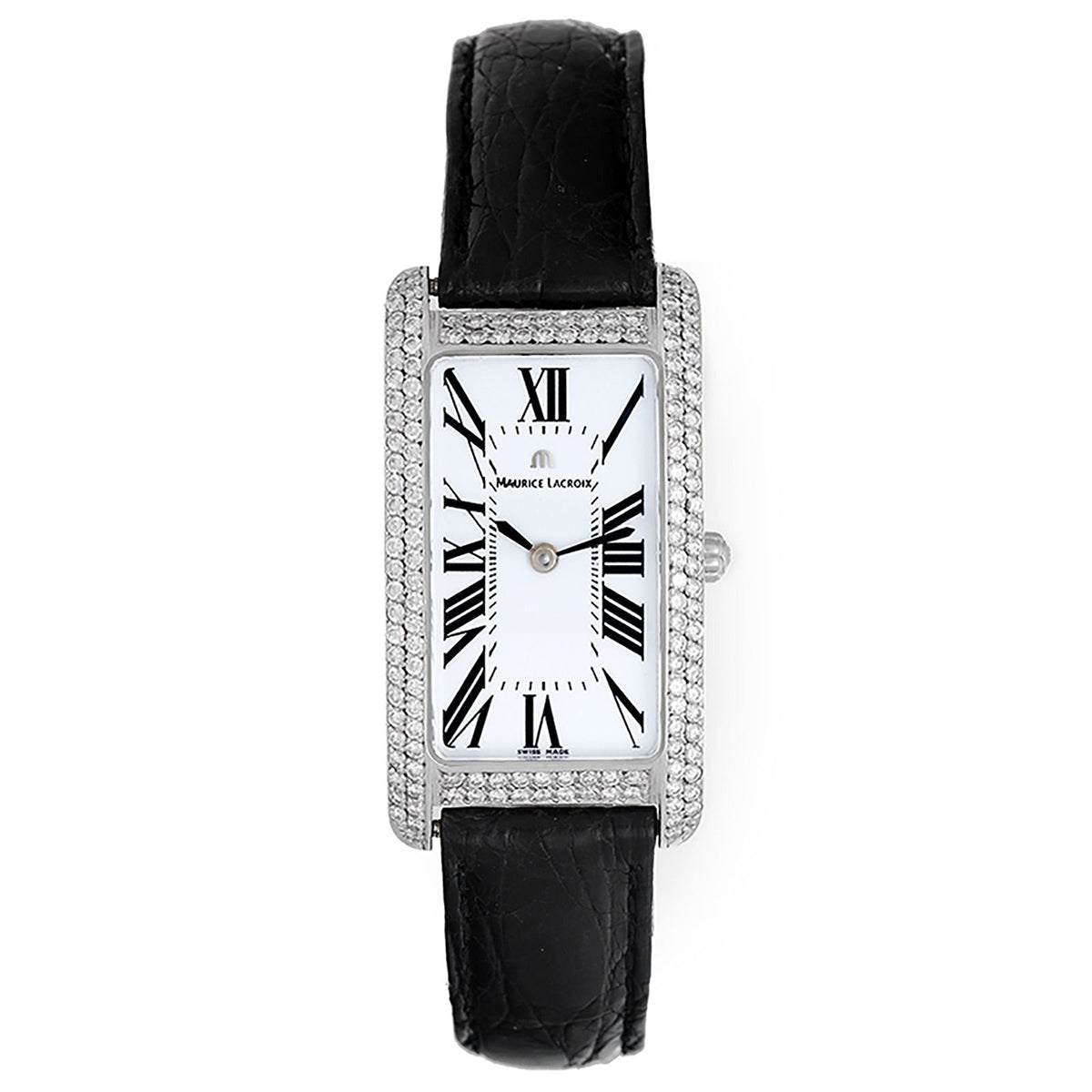 Maurice Lacroix Fiaba 18k White Gold & Diamond Ladies Watch - Quartz. 18k white gold case with diamond bezel (21mm x 39mm). White dial with black Roman numerals. Strap band with 18k white gold Maurice Lacroix buckle. Pre-owned with custom box.