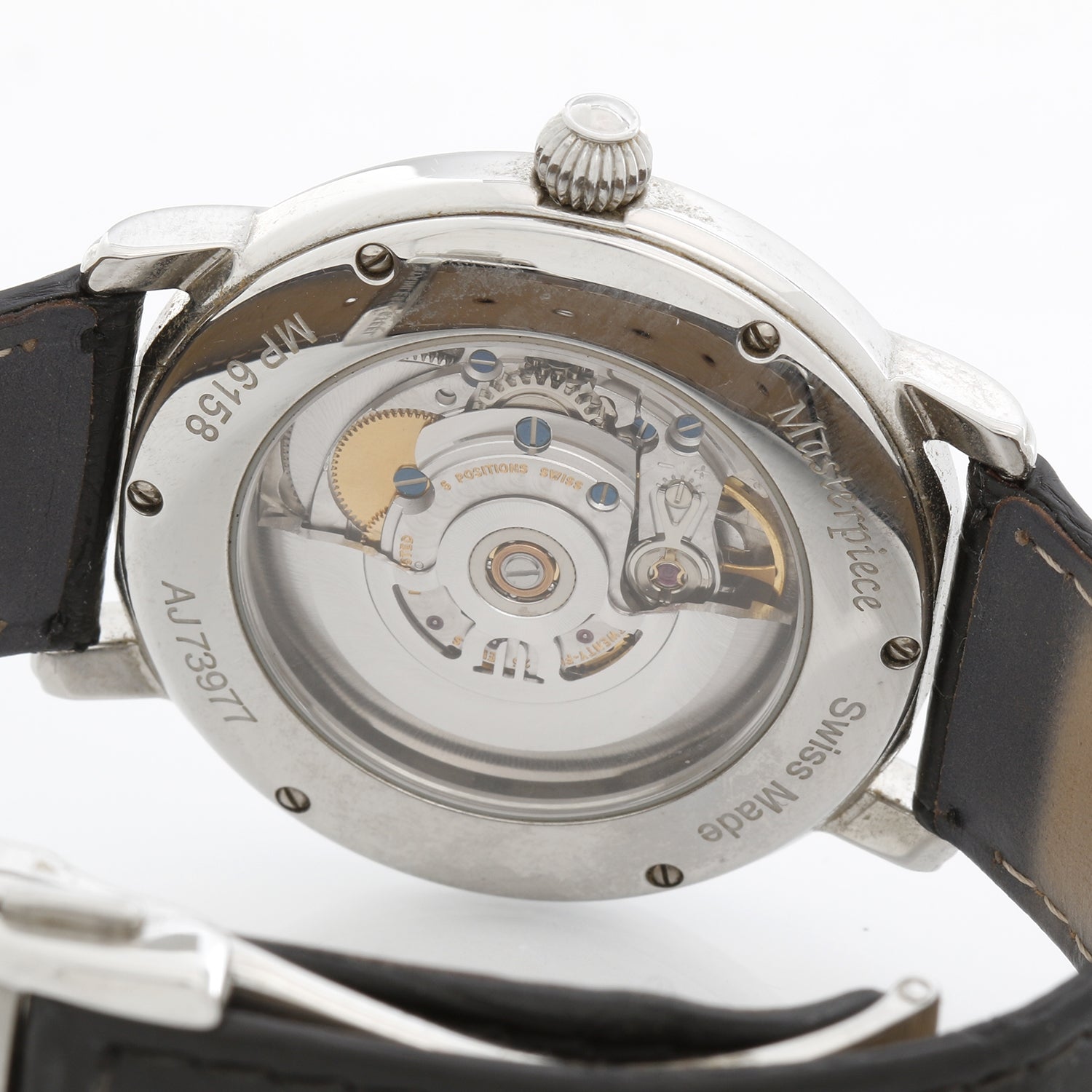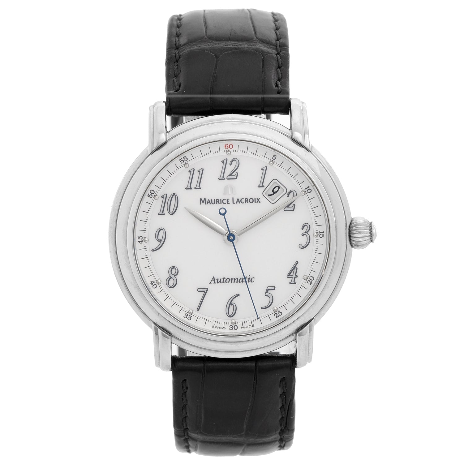 Maurice Lacroix Masterpiece Automatique Men's Watch MP 6158 - Automatic winding. Stainless steel case ( 40 mm ). White dial with silver Arabic numerals ; date between 1 & 2 o'clock. Black Maurice Lacroix alligator strap with Stainless steel Maurice Lacroix deployant clasp. Pre-owned with custom box .