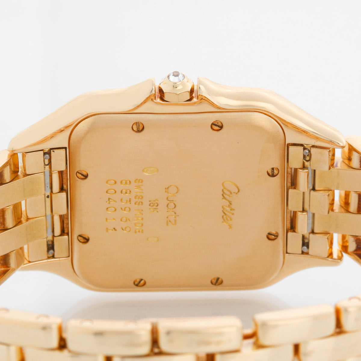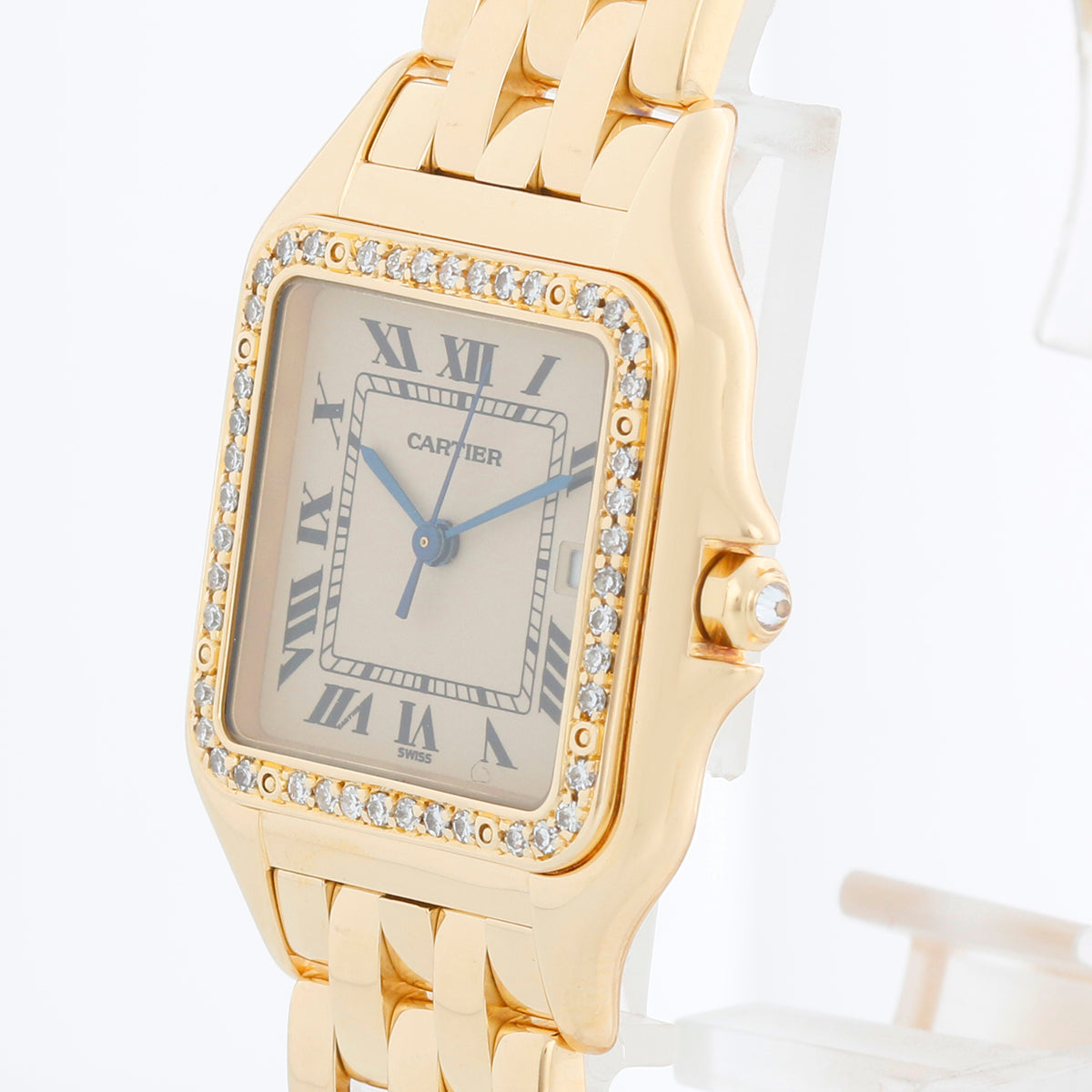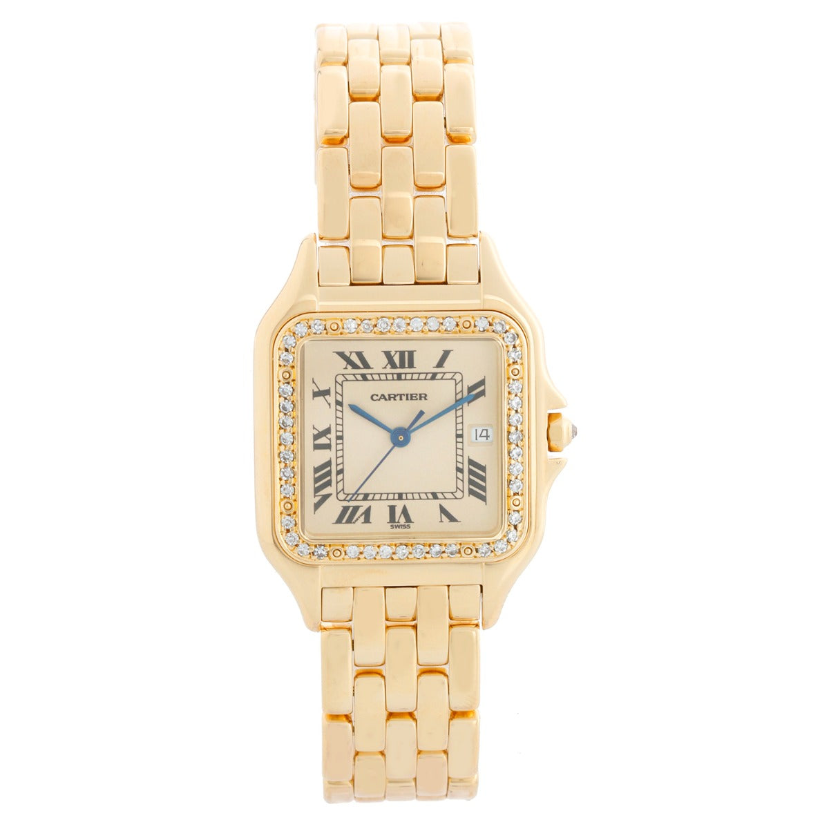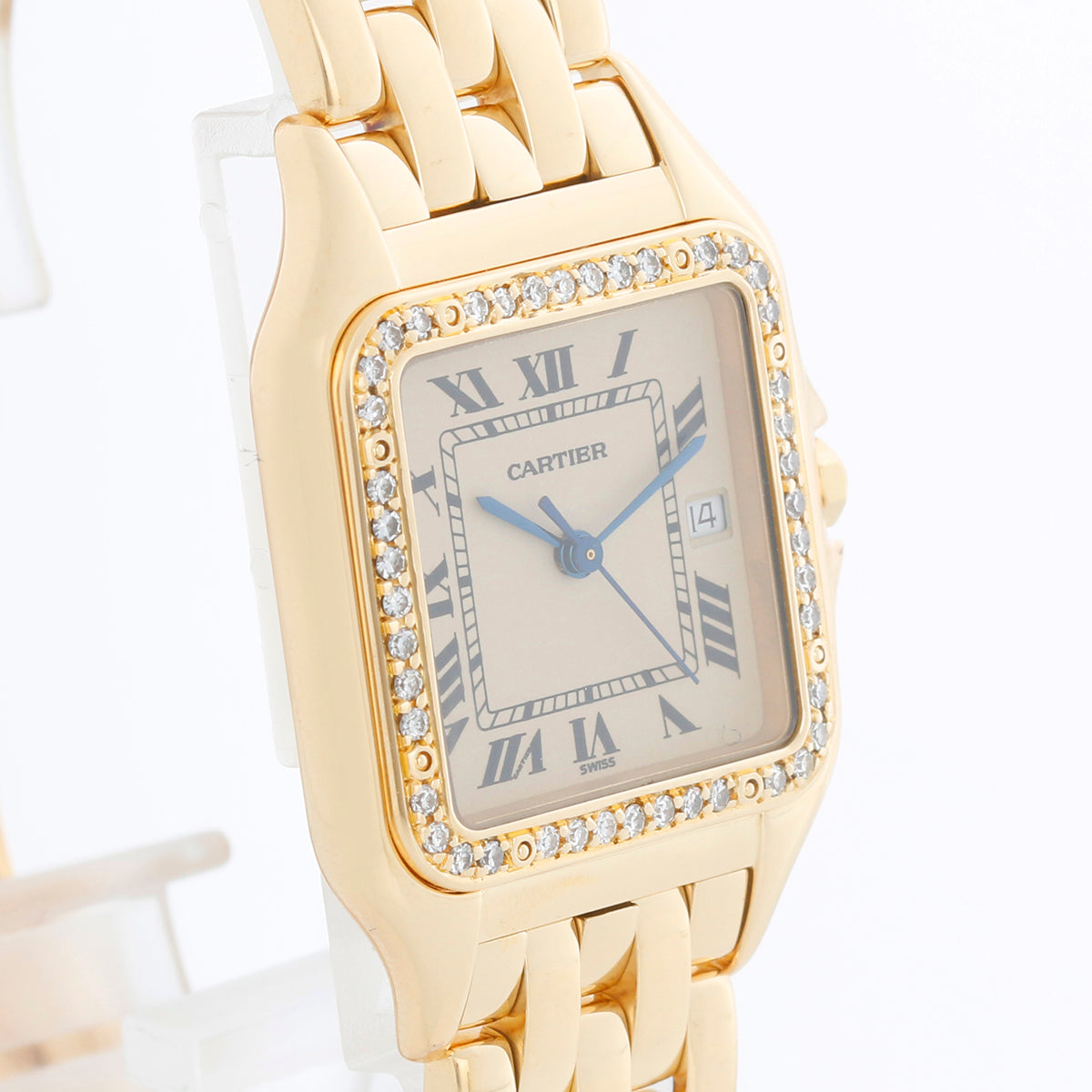 Cartier Panther 18k Yellow Gold Men's Quartz Watch with Date & Diamonds - Quartz. 18k yellow gold case with factory diamond bezel (27mm x 38mm). Ivory colored dial with black Roman numerals and date at 3 o'clock. 18k yellow gold Cartier Panther bracelet with deployant clasp; will fit a 6 inch wrist . Pre-owned Cartier box.
