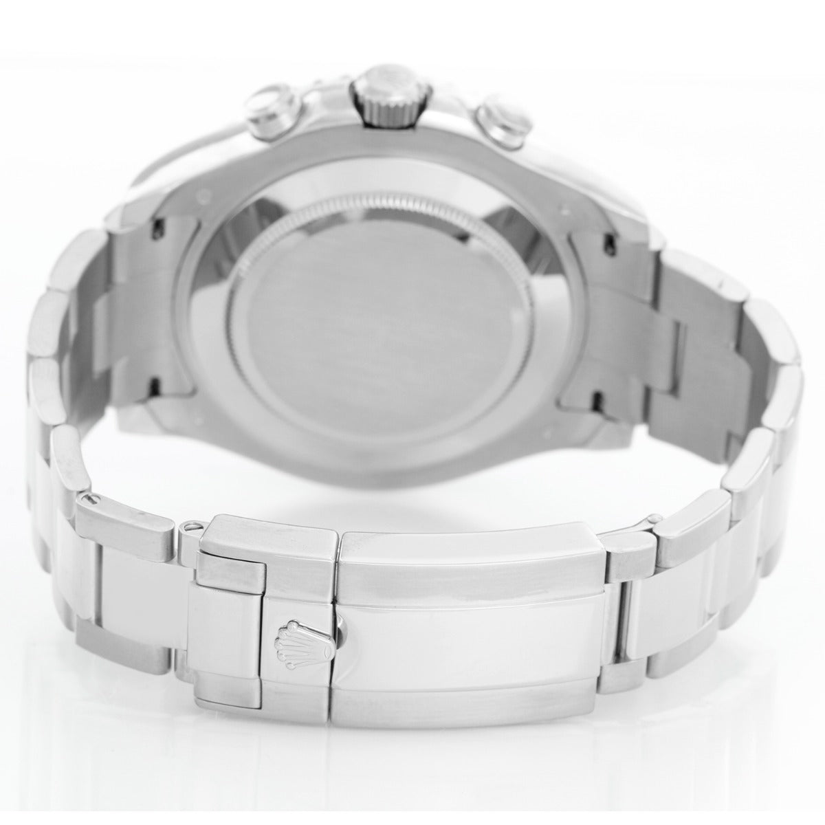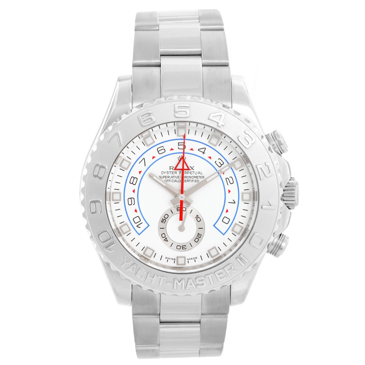 Men's 18k White Gold Rolex Yacht-Master II Regatta Watch 116689 - Automatic winding, Regatta Chronograph, 31 jewels, sapphire crystal. 18k white gold case with rotatable Ring Command bezel with blue insert (44mm diameter). White dial with luminous markers; gold rimmed seconds subdial; seconds recorder; regatta count-down chronograph. 18k white gold Oyster bracelet with flip-lock clasp. Pre-owned with Rolex box, books and card. Card dated 2008