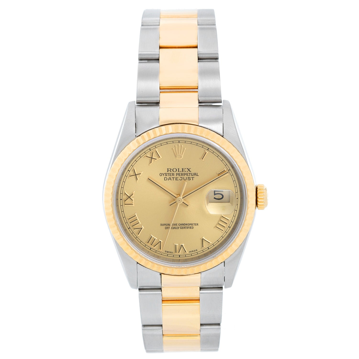 Rolex Men's Two Tone Datejust 16233 - Automatic winding, Quickset, sapphire crystal. Stainless steel case with fluted bezel (36mm diameter). Champagne dial with Roman numerals. Stainless steel and 18k yellow gold oyster bracelet. Pre-owned with custom box.