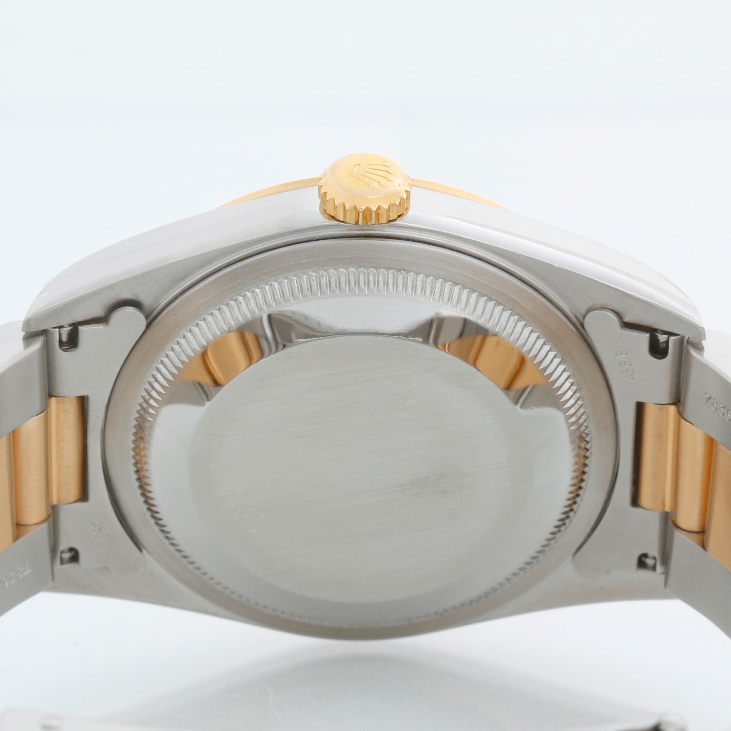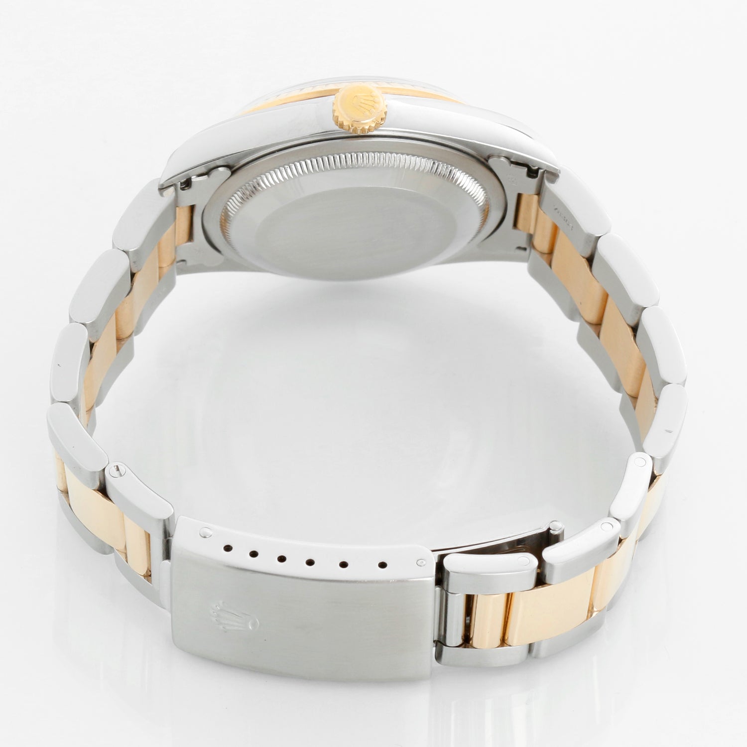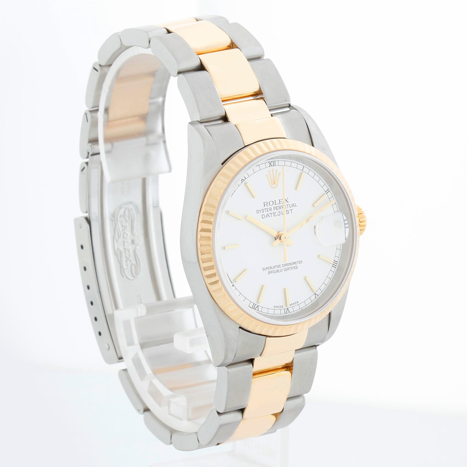 Rolex Datejust Men's White Stick Dial 2-Tone Watch 16233 - Automatic winding, 31 jewels, Quickset, sapphire crystal. Datejust. Stainless steel with 18k yellow gold fluted bezel. White dial with stick hour markers. Stainless steel and 18K Yellow gold Oyster bracelet. Pre-owned with Rolex Box and papers. Dated 2003.