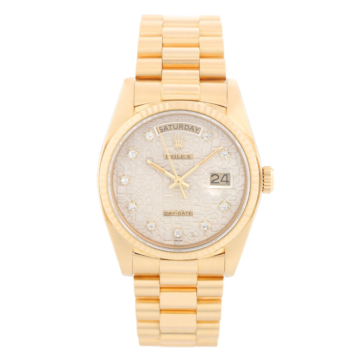 Rolex President Day-Date Men's 18k Gold Watch 18038 - Automatic winding; quick-set; sapphire crystal. 18k yellow gold case with Fluted bezel (36mm diameter). Jubilee Silver diamond dial with stick markers. 18k yellow gold hidden-clasp President bracelet. Pre-owned with box and books