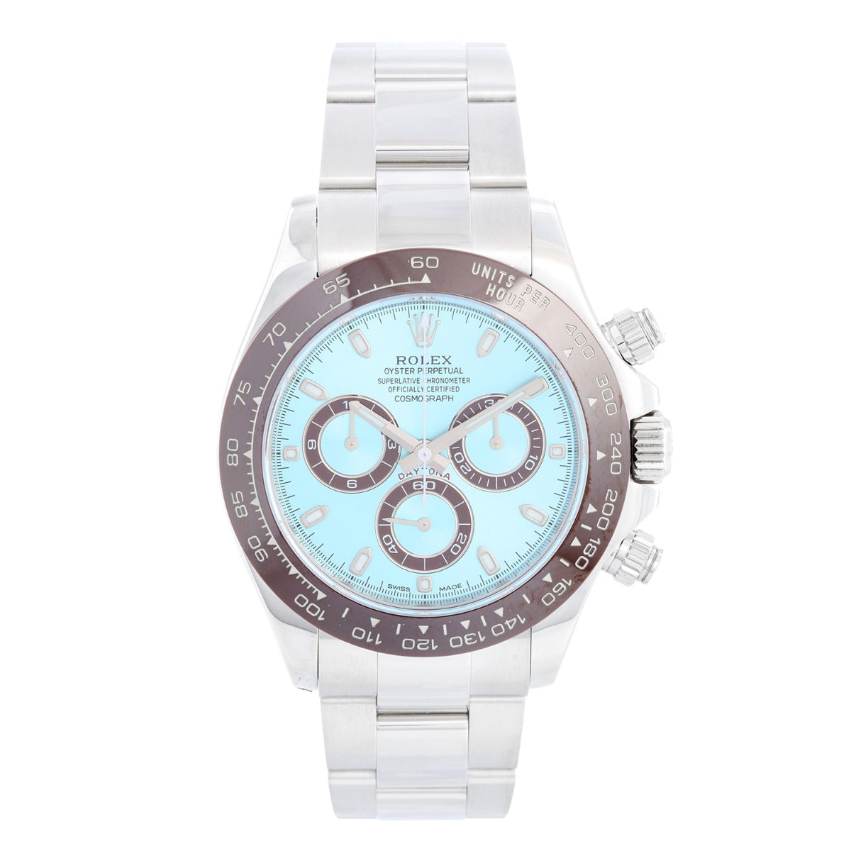 Men's Platinum Rolex Daytona Watch 116506 with Glacier Blue dial - Automatic winding, chronograph, 44 jewels, sapphire crystal. Platinum case (40mm diameter) with Fixed Chestnut Brown Cerachrom Tachymeter Engraved Bezel. Glacier Blue. Platinum Oysterlock bracelet. Pre-owned with Rolex box, books and warranty card.