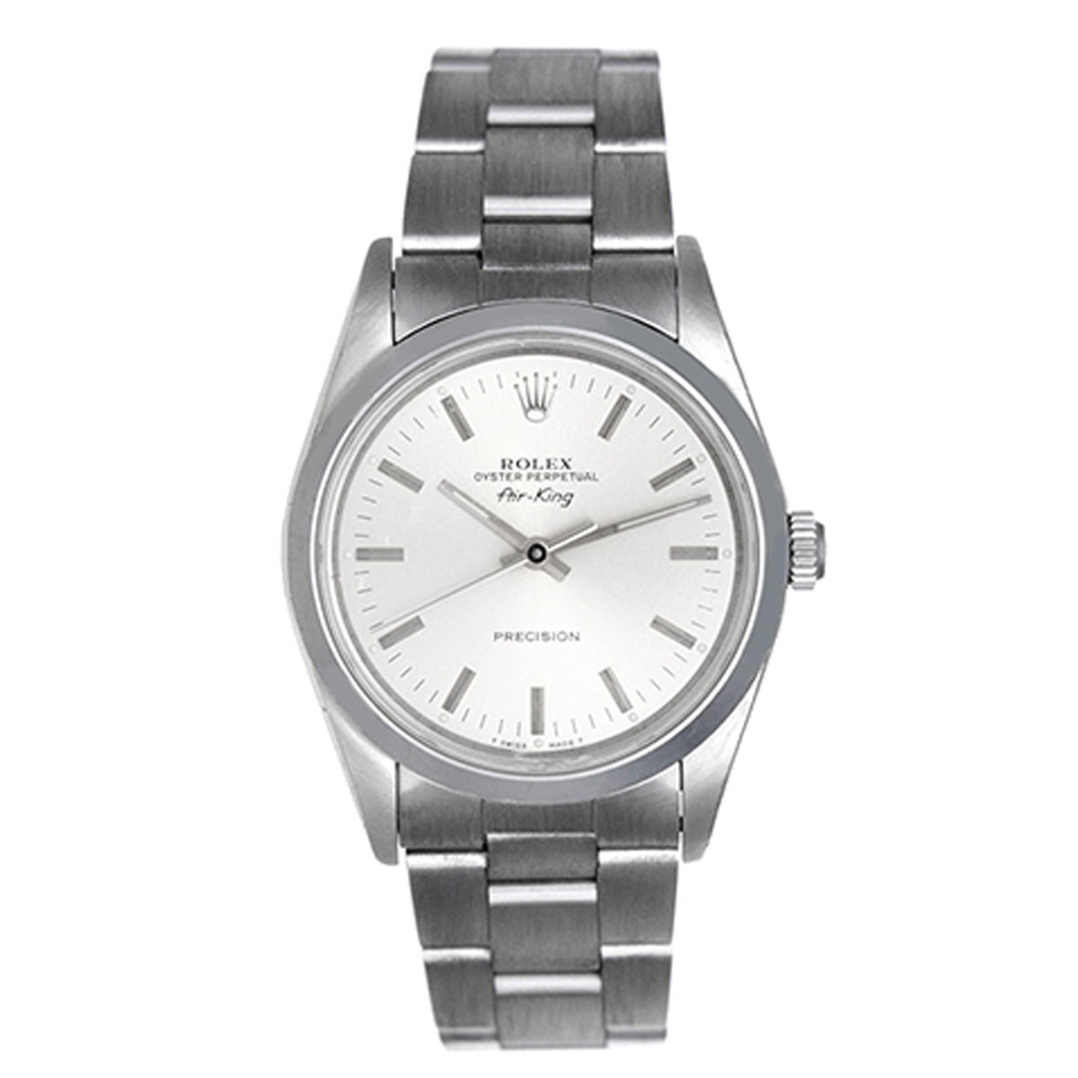 Men's Rolex Air-King Watch 14000 - Automatic. Stainless steel case with smooth bezel (33mm diameter). Silver dial with stick markers. Stainless steel Oyster bracelet. Pre-owned with box.