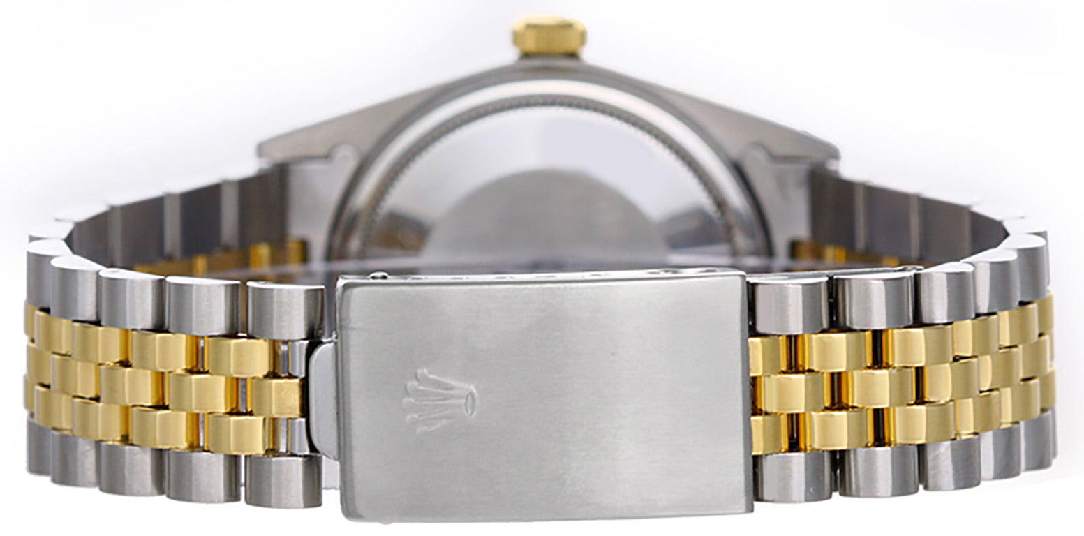 Men's Rolex Datejust 2-Tone Watch 16013 - Automatic winding, 27 jewels, Quickset, acrylic crystal. Stainless steel and 18k yellow gold fluted bezel (36mm diameter). Champagne Tapestry dial with stick markers. Stainless steel and 18k yellow gold Jubilee bracelet. Pre-owned with custom box