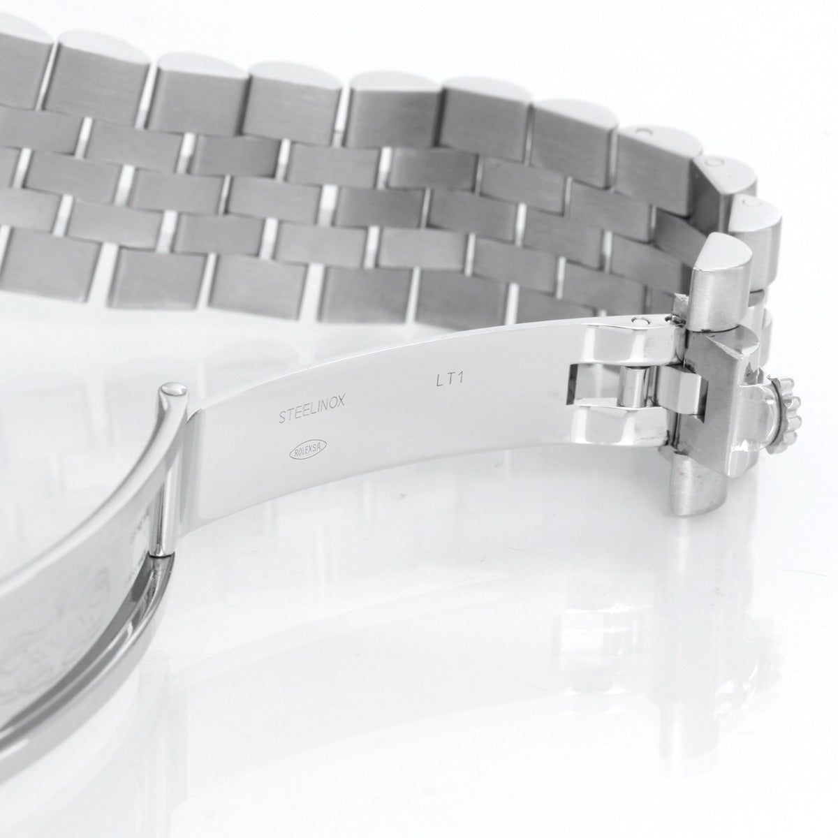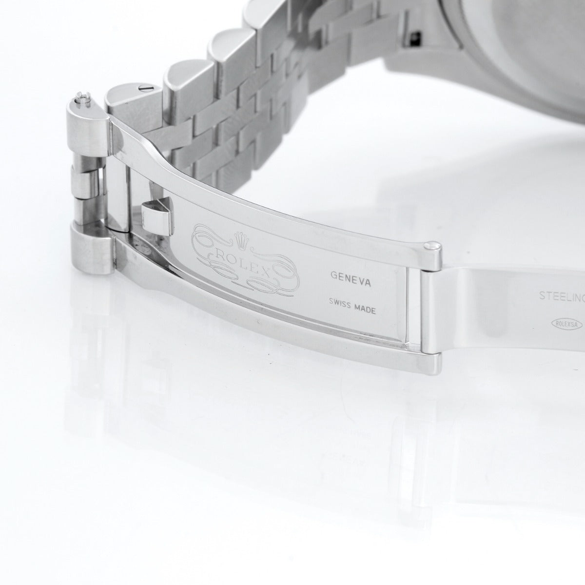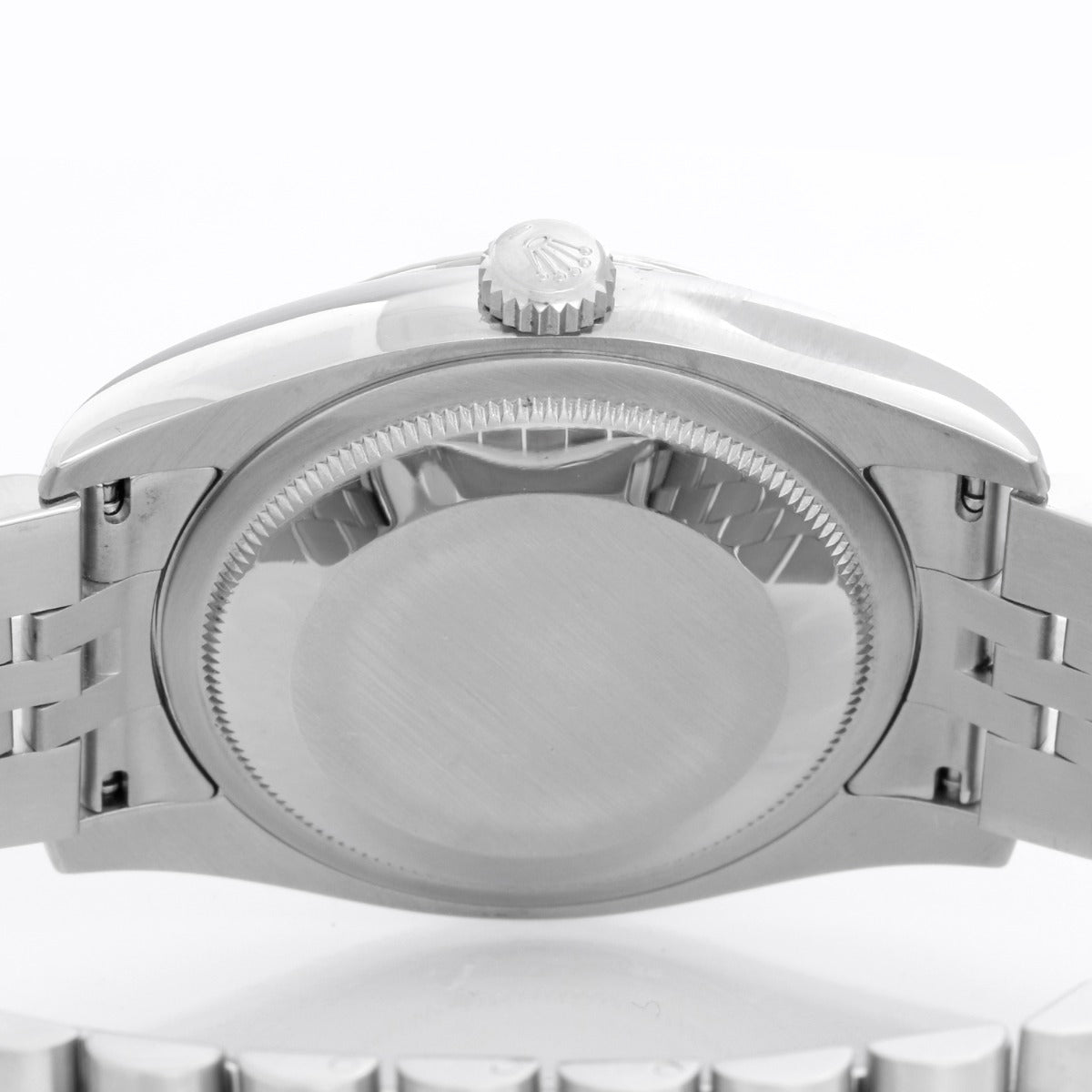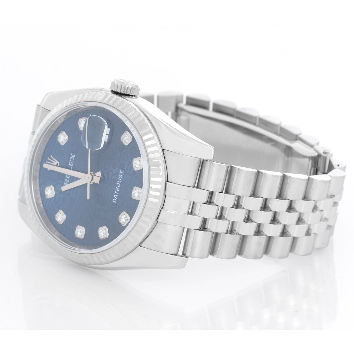 Rolex Datejust Men's Stainless Steel Watch 116234 - Automatic winding, 31 jewels, Quickset, sapphire crystal. Stainless steel case with 18k white gold fluted bezel . Blue jubilee dial with diamonds . Stainless steel hidden-clasp Jubilee bracelet bracelet. Pre-owned with custom box.