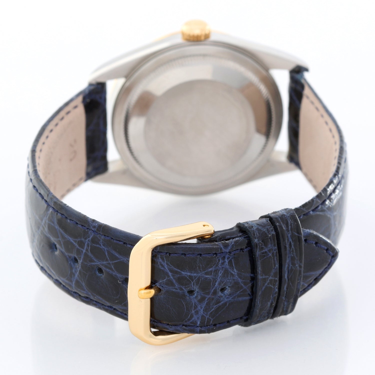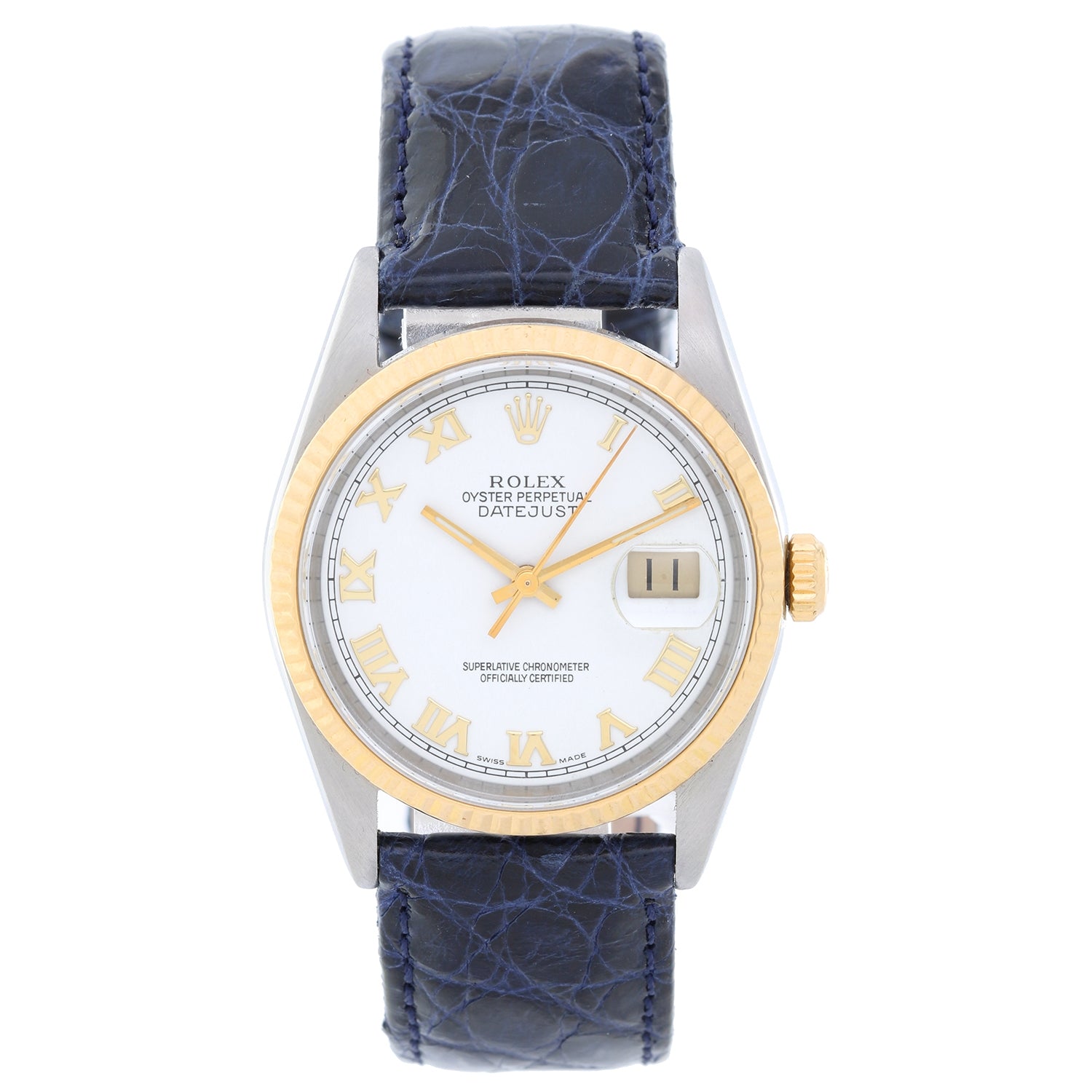 Rolex Datejust Model 16233 - Men's stainless steel and 18k yellow gold wristwatch with date display (36mm diameter). Sapphire crystal. 18k yellow gold fluted bezel.White dial with gold Roman numerals. 31 jewel superlative officially certified chronometer movement.Blue alligator strap. Pre-owned with custom box.