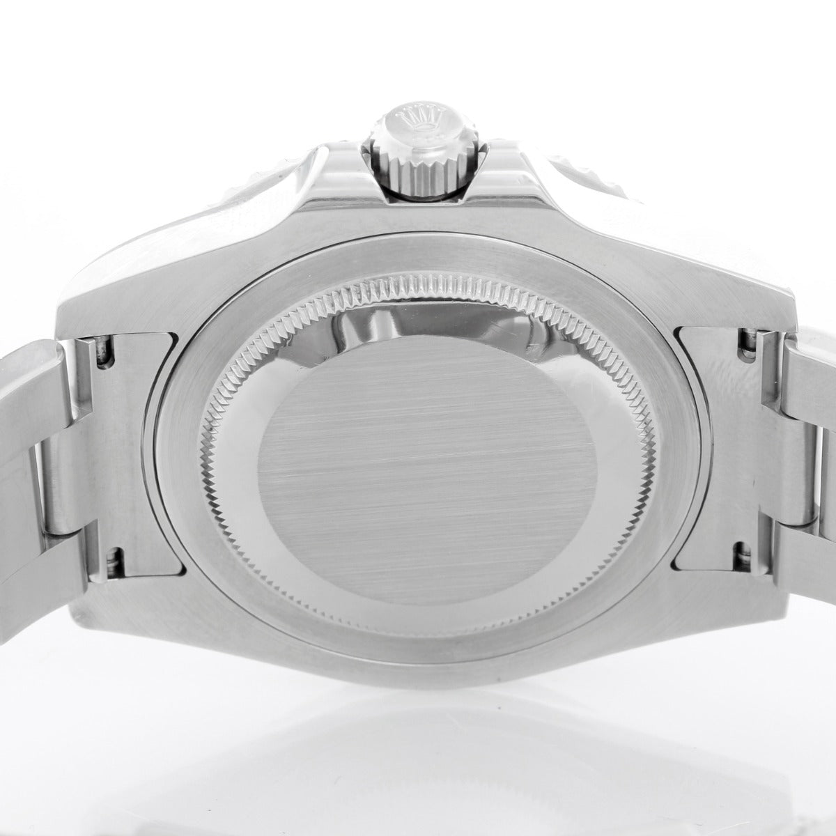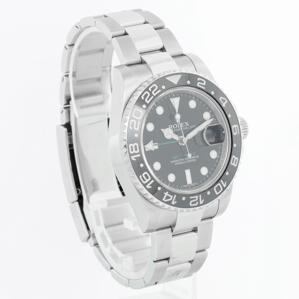 Men's Rolex GMT-Master II Watch Ceramic Bezel 116710 (116710N) - Automatic winding, 31 jewels. Stainless steel case with 24 hour ceramic bezel, engraved inside (40mm diameter). Black dial with luminous markers; green GMT hand. Stainless steel Oyster bracelet with flip-lock clasp. Pre-owned with Rolex box, books