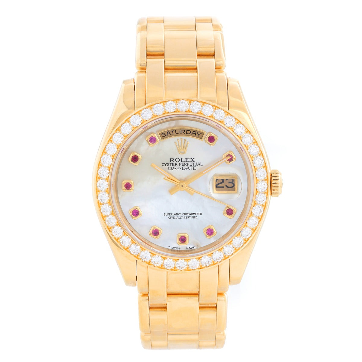 Men's Rolex Masterpiece 18k Yellow Gold Watch 18948 - Automatic winding, 31 jewel, sapphire crystal. 18k yellow gold case with 40-diamond factory bezel (39mm diameter). Genuine Rolex Mother-of-Pearl dial with Ruby hour markers. 18k yellow gold Masterpiece bracelet. Pre-owned with Rolex box and books.