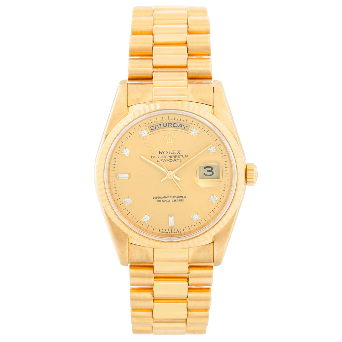 Rolex President Day-Date Men's Watch 18238 - Automatic winding,31 jewels, Quickset, sapphire crystal. 18k yellow gold case with fluted bezel . Factory Champagne diamond dial. 18k yellow gold hidden-clasp President bracelet. Pre-owned with Rolex box and books.