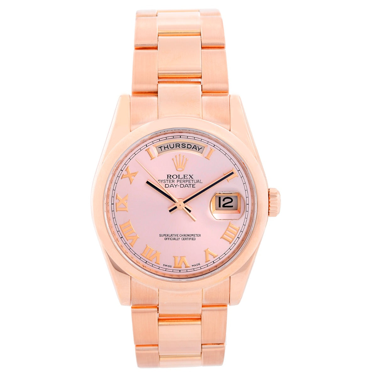 Rolex President Day-Date Men's 18k Rose Gold Watch 118205 - Automatic winding, 31 jewels, Quickset, sapphire crystal. 18k rose gold case with smooth bezel (36mm diameter). Rose dial with rose gold Roman numerals. 18k rose gold Oyster bracelet. Pre-owned with box and book.