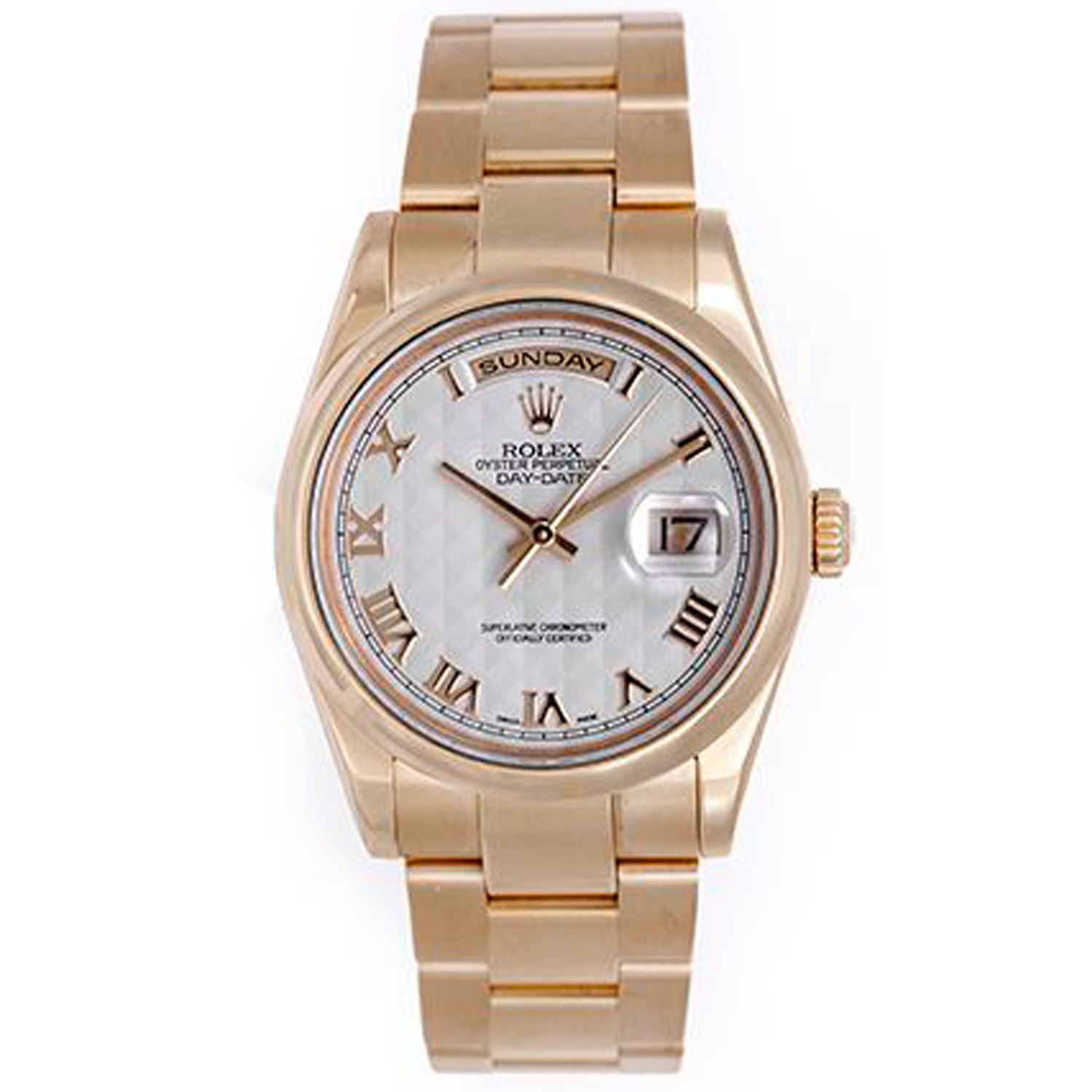 Rolex President Model 118208, Day-Date - Men's 18k yellow gold wristwatch (36mm diameter). Off-white Pyramid dial with gold Roman numerals. Sapphire crystal. 18k yellow gold smooth bezel. 18k yellow gold hidden-clasp President bracelet. 31 jewel superlative officially certified chronometer movement. Pre-owned with Rolex box and books.