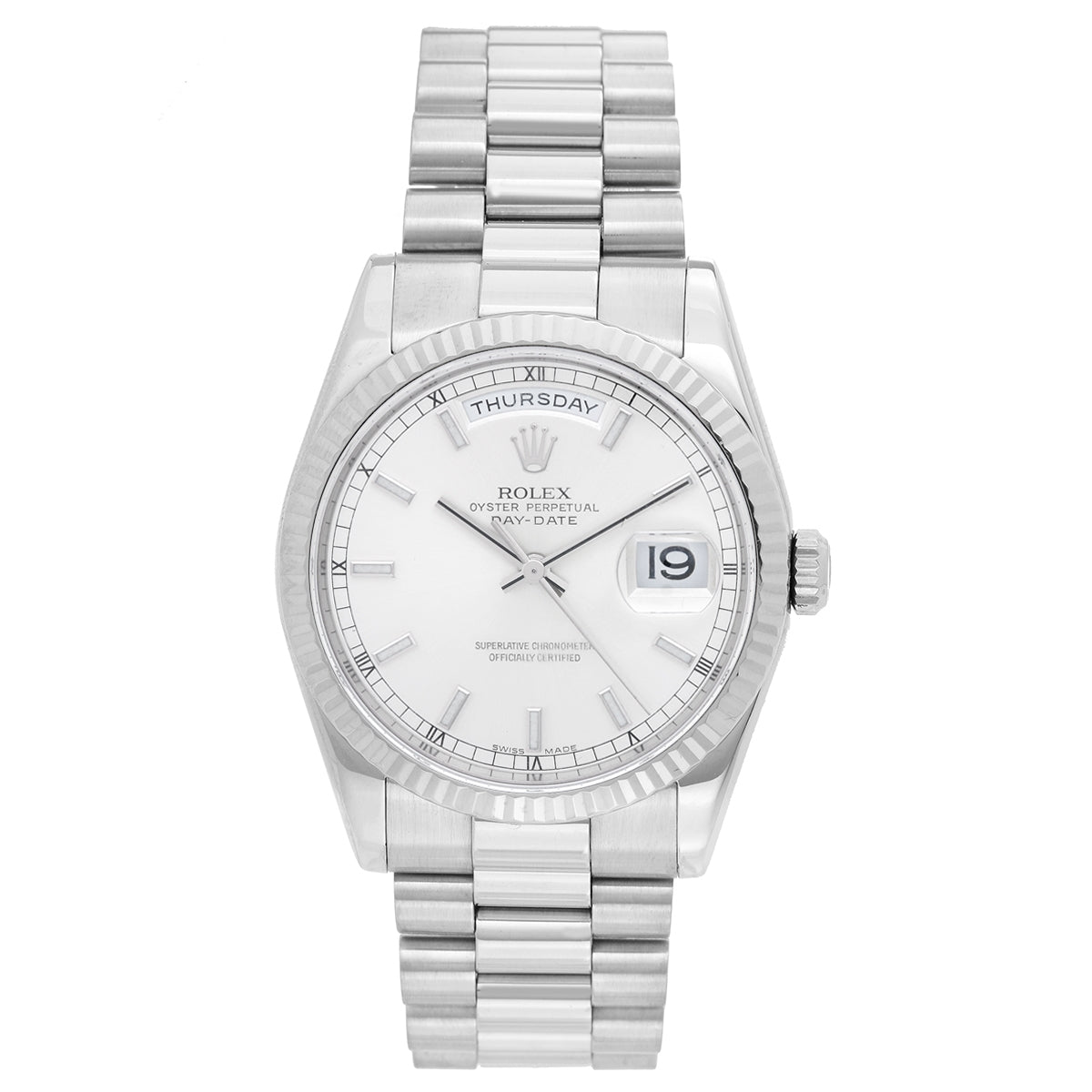 Rolex President Model 118239, Day-Date Men's 18k white gold wristwatch (36mm diameter) with sapphire crystal and fluted bezel. Silver dial with stick markers. 18k white gold hidden clasp President bracelet. Pre-owned with Rolex box and books.
