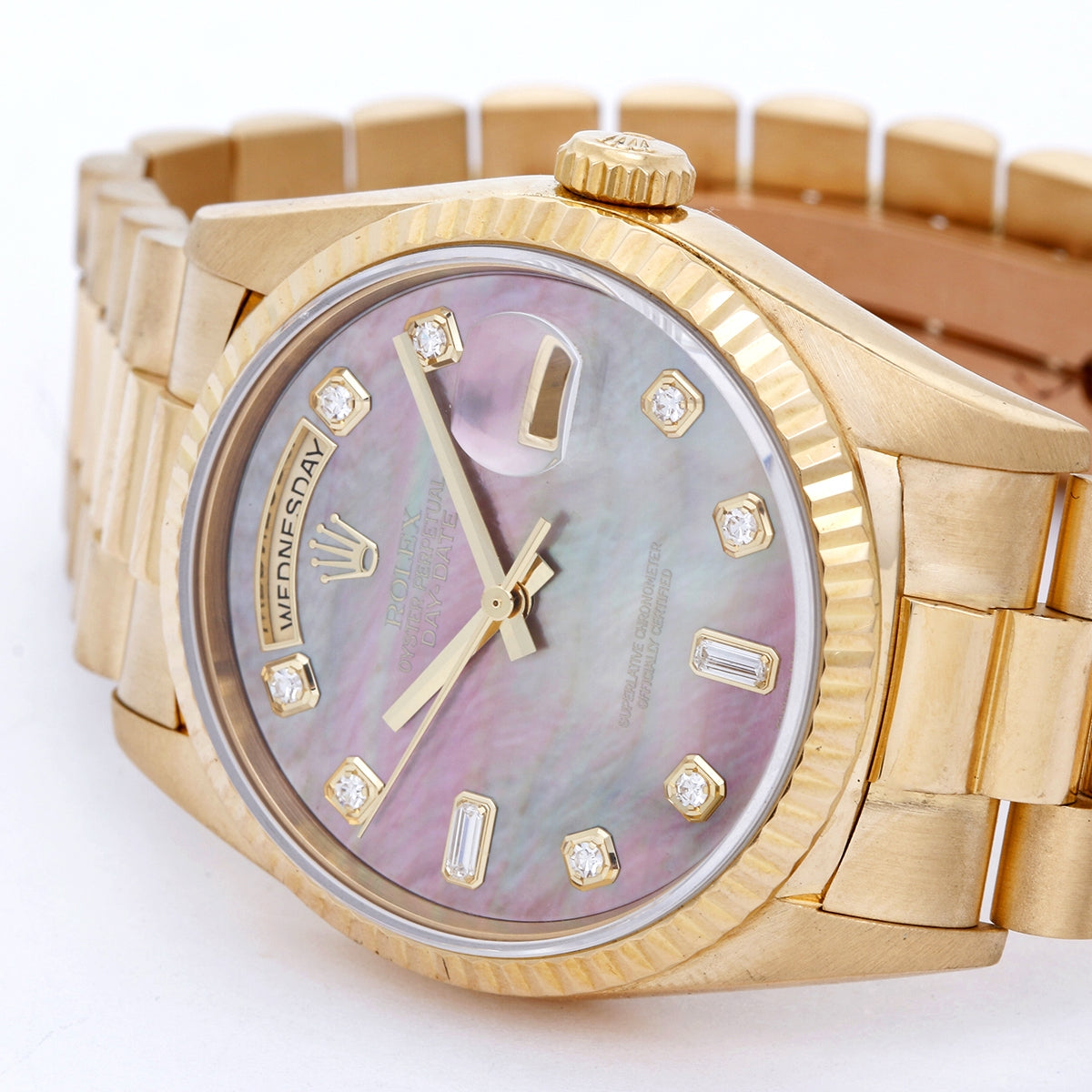 Men's Rolex President Day-Date Watch Factory Bezel & MOP Sapphire Dial 18238 - Automatic winding, 31 jewels, double quickset, sapphire crystal. 18k yellow gold case (36mm diameter). Factory Tahitian mother of pearl dial with diamond hour markers. 18k yellow gold hidden-clasp President bracelet. Pre-owned with Rolex box and books.