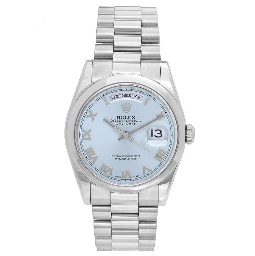 Rolex President, Model 118206 - Day-Date - Men's Platinum wristwatch (36mm diameter) with sapphire crystal and smooth bezel. Glacier blue dial with Roman numerals. Platinum hidden clasp President bracelet. Pre-owned with Rolex box and books.