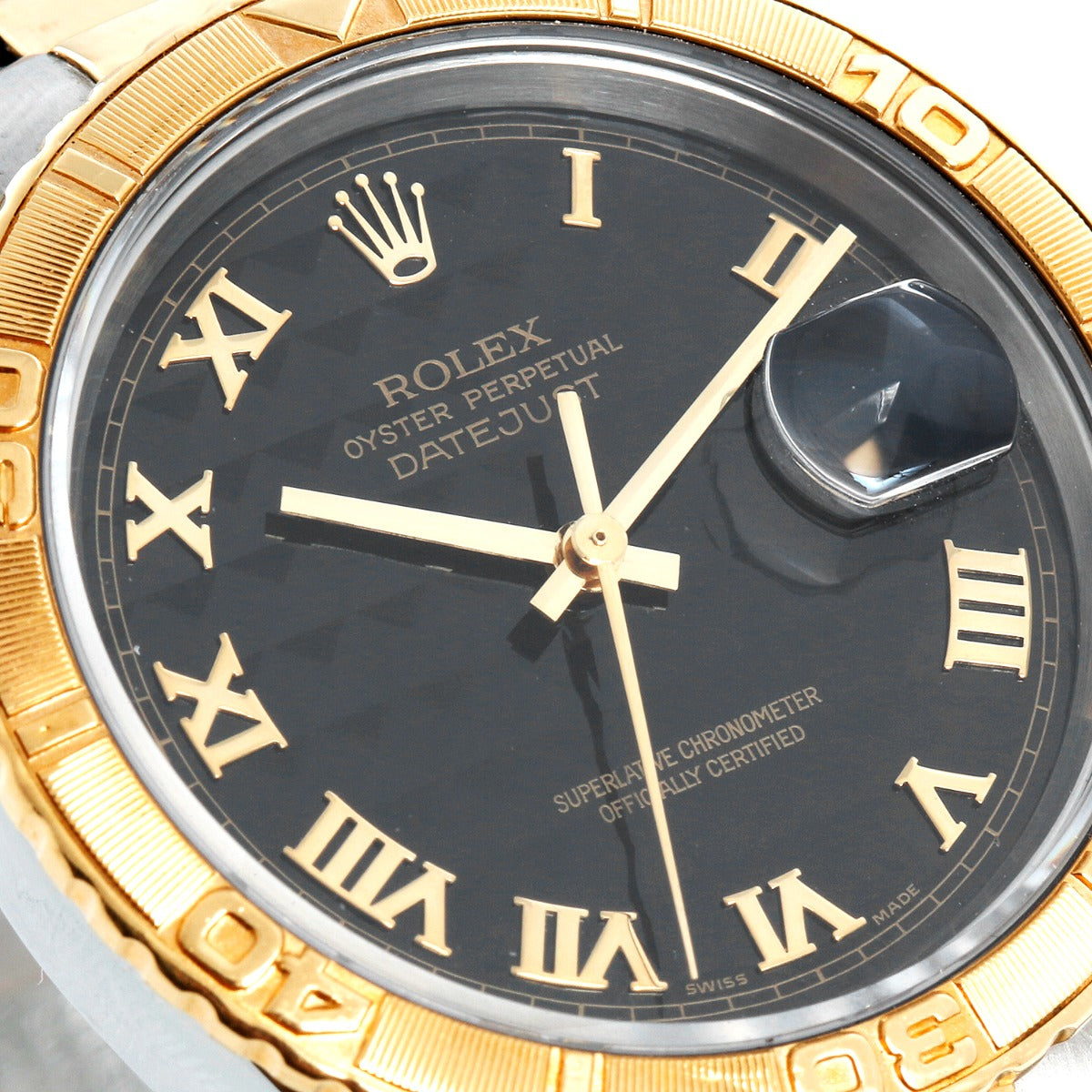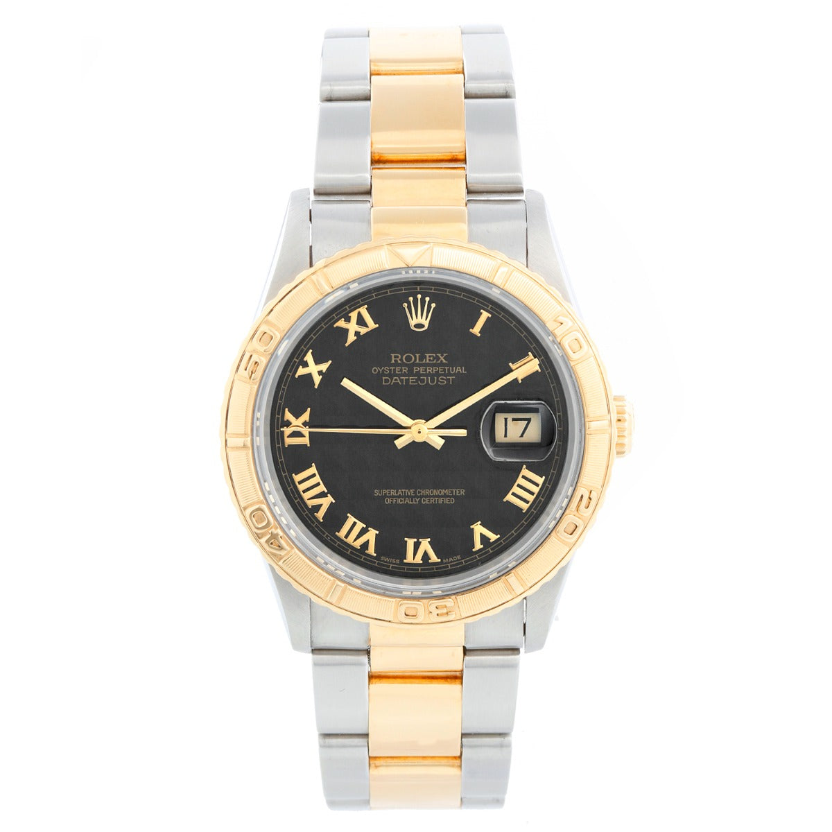Rolex Turnograph Men's 2-Tone Watch 16263 - Automatic winding, 31 jewels, Quickset, sapphire crystal. Stainless steel case with 18k yellow gold bezel (36mm diameter). Black Pyramid dial . Stainless steel and 18k yellow gold Oyster bracelet. Pre-owned with Rolex Travel box.