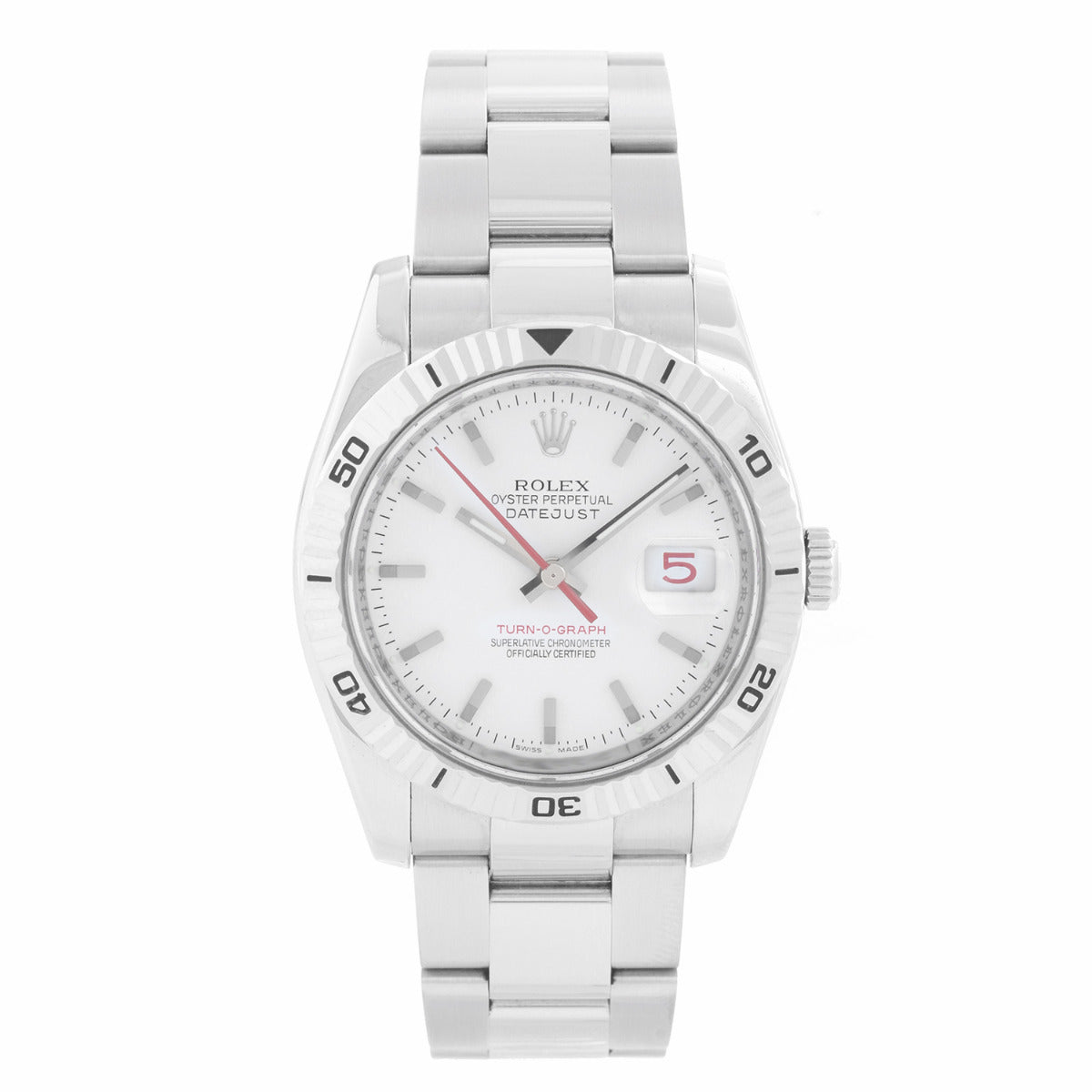 Men's Rolex Turnograph Datejust Stainless Steel Watch 116264 - Automatic winding, 31 jewel, sapphire crystal. Stainless steel case with 18k white gold Thunderbird bezel (36mm diameter). White dial with stick markers; red date and second hand. Stainless steel Oyster bracelet. Pre-owned with custom box