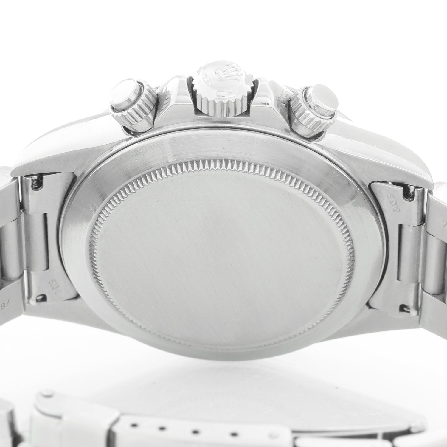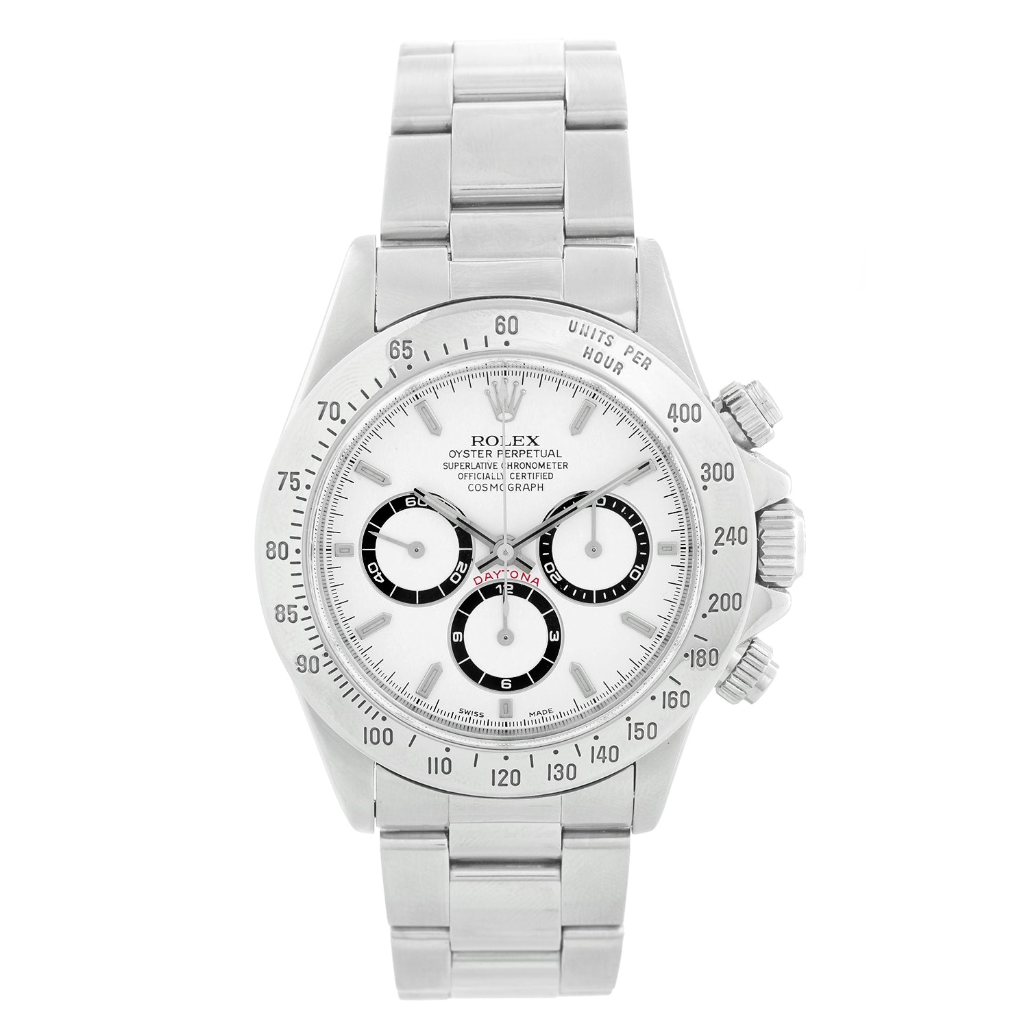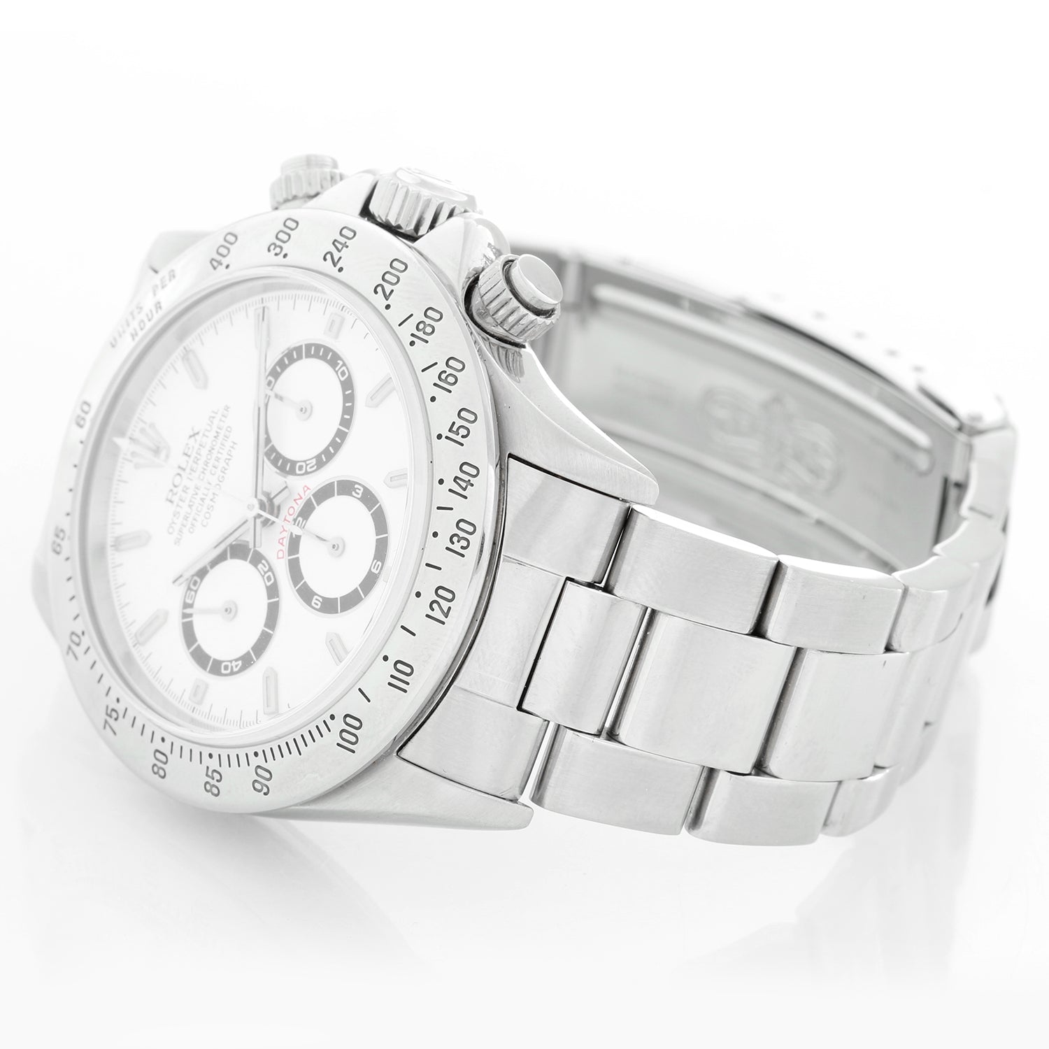 Rolex Zenith Daytona Steel Men's Watch 16520 - Men's automatic winding chronograph wristwatch Stainless steel case (40mm diameter) with tachymeter bezel. Sapphire crystal. White dial with luminous hour markers. Stainless steel Oyster bracelet with flip-lock clasp. Pre-owned with Rolex box & papers. W series