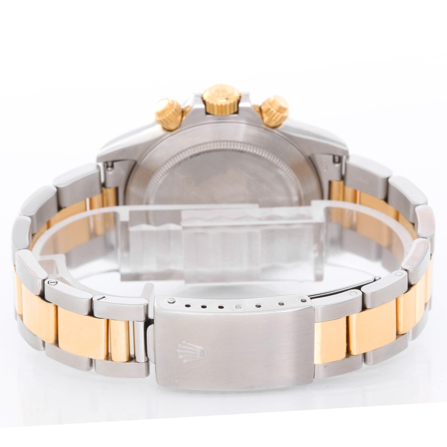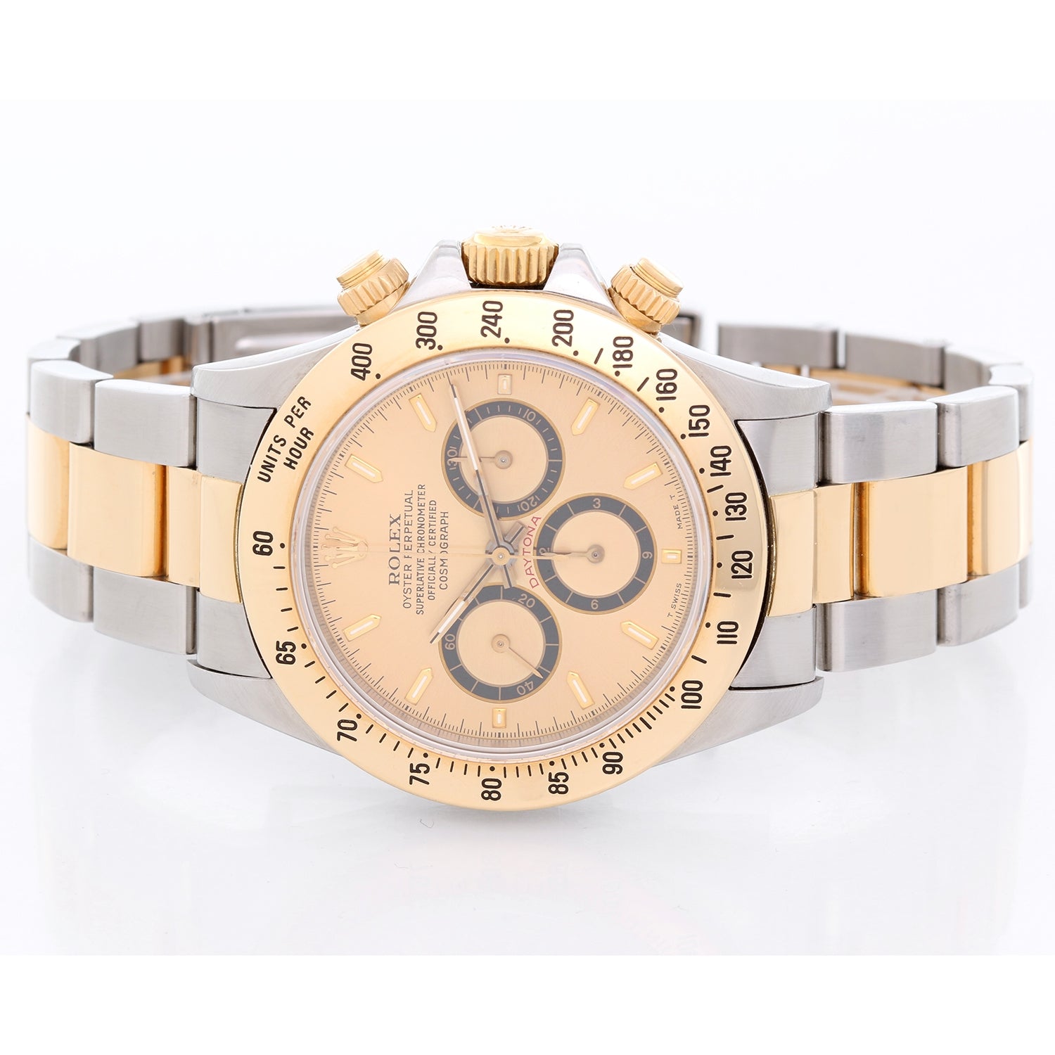 Rolex Cosmograph Daytona, Model 16523, - Men's stainless steel and 18k yellow gold automatic-winding chronograph wristwatch (40mm diameter). Sapphire crystal. 18k yellow gold engraved bezel with tachymeter graduation. Champagne dial with gold markers. Stainless steel and 18k yellow gold oyster bracelet with flip-lock clasp. 31 jewel superlative officially certified chronometer movement. Pre-owned with Rolex box and books.