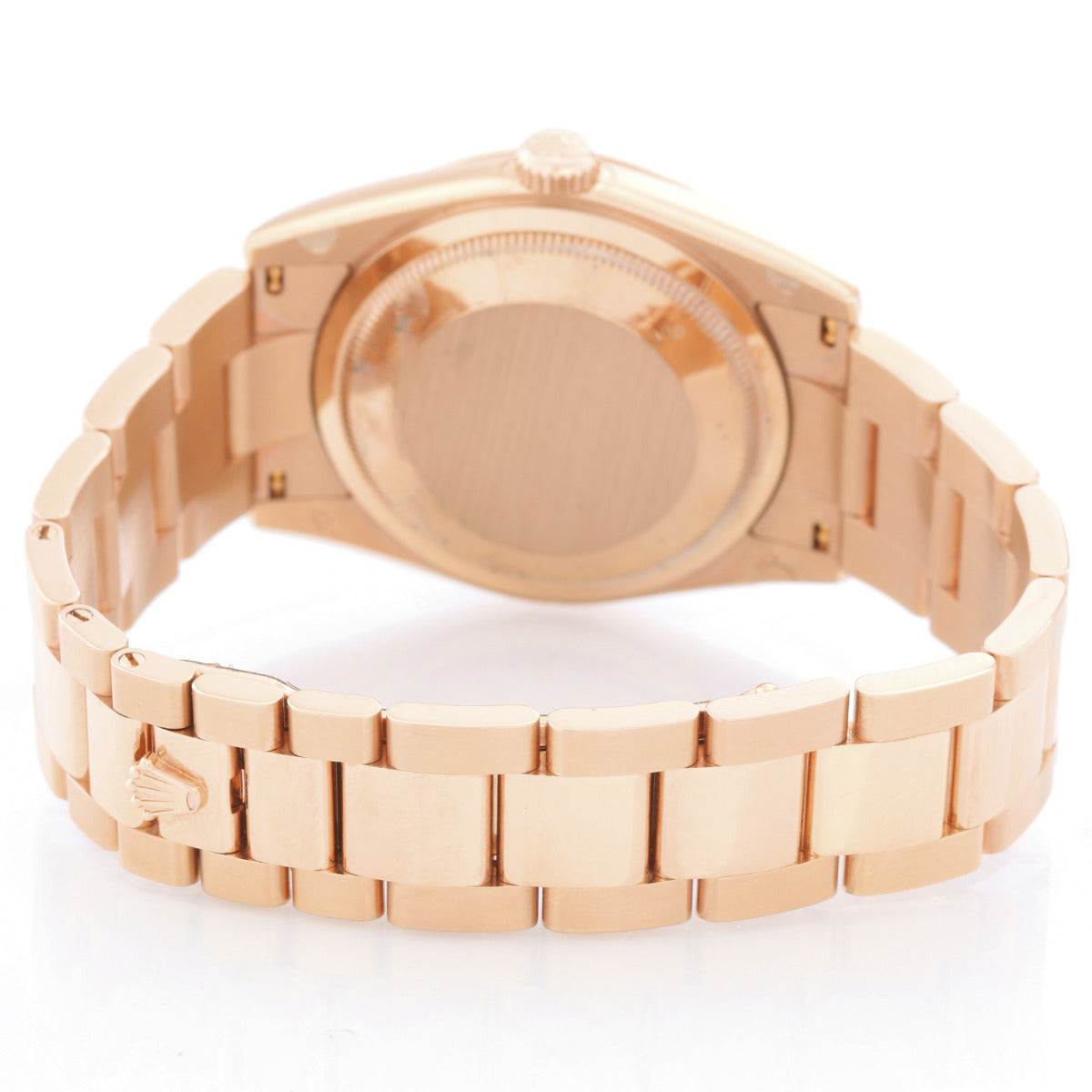 Men's Rose Gold Rolex President Day-Date Watch 118205 Silver Diamond Dial - Automatic winding, 31 jewels, Quickset, sapphire crystal. 18k rose gold case with smooth domed bezel (36mm diameter). Silver dial with factory diamond hour markers. 18k rose gold Oyster bracelet with deployant clasp. Pre-owned with box and books.