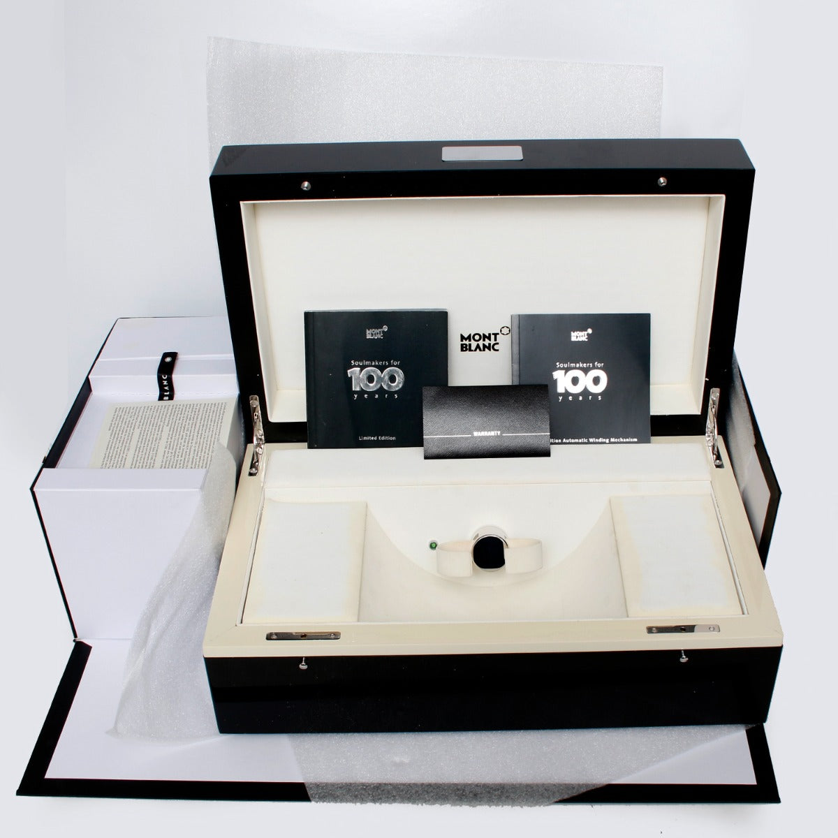 Montblanc Star Chronograph GMT 1906 Rose Gold Perpetual Limited Edition - COSC-certified mechanism (Controle Officiel Suisse des Chronometres) that features not only all the classic functions of the most advanced chronographs but has an added GMT display along with one of the industry's most sophisticated complications of the perpetual calendar.. 18k rose gold case (42mm). Silver dial with Roman numerals. Day,Date, Month, & Second time zone sub dials. Strap band with deployant. Pre-owned with box and papers. 100th Anniversary. Limited to 100 pieces.