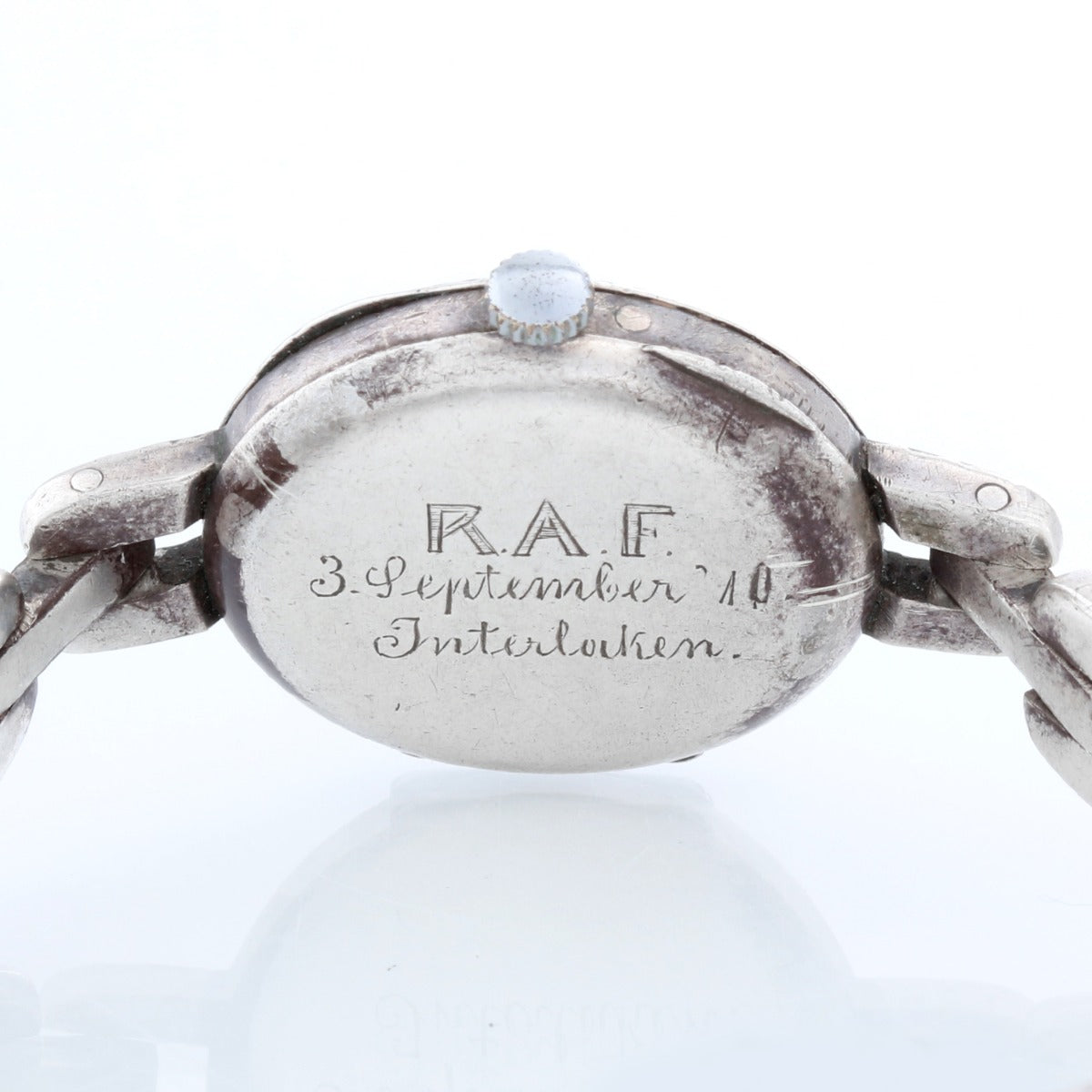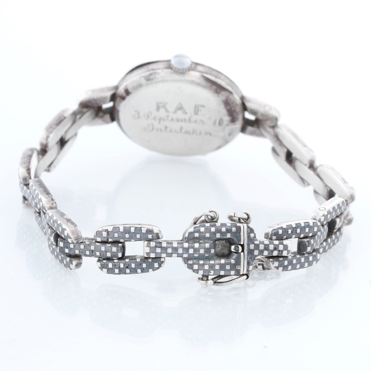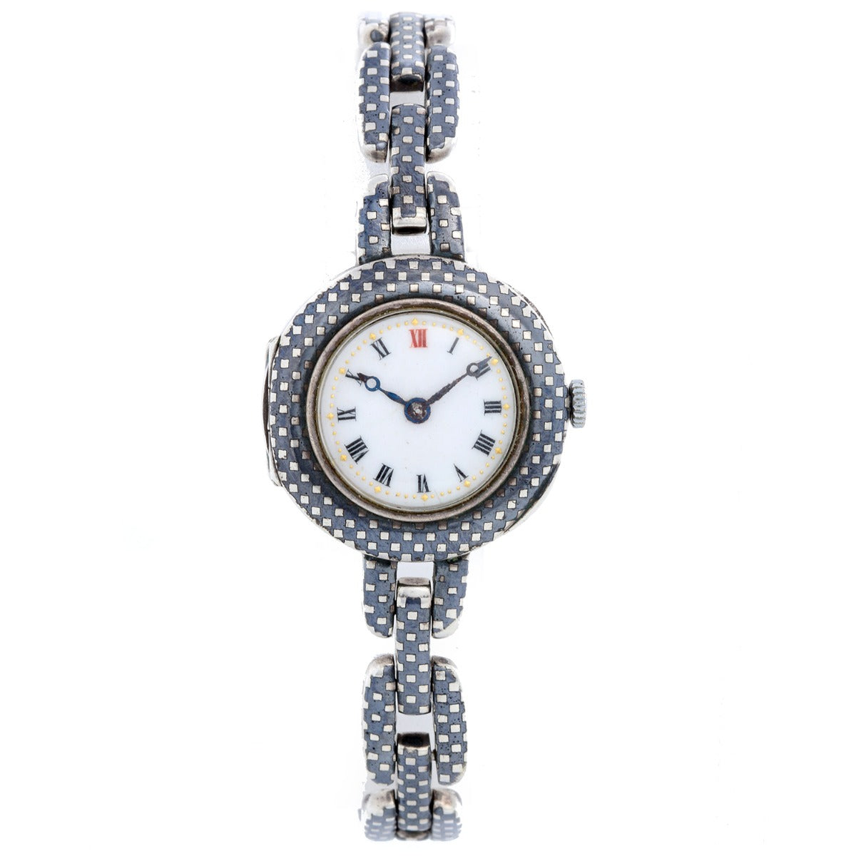 Niello Ladies Manual Winding Wrist Watch - Manual. Steel case with checkered Niello pattern ( 26 mm) . White dial with Roman numerals. Niello checkered link bracelet; fits a 7 1/4 inch wrist. Pre-owned with custom box.