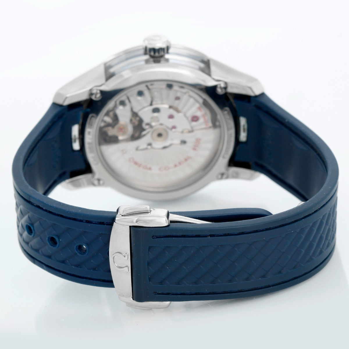 Omega De Ville Hour Vision Co-Axial Master Chronometer - Automatic chronometer movement. Stainless steel case ( 41 mm ) skeleton back and sapphire openings on the side. Blue concentric dial with date at 3 o 'clock. Blue rubber strap with stainless Omega deployant buckle. Pre-owned with custom box.