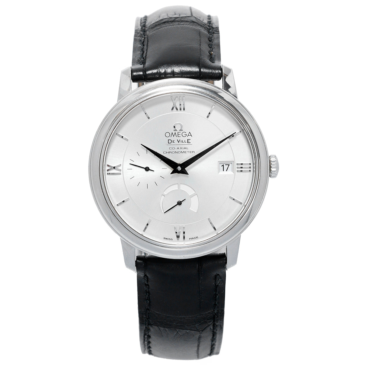Omega De Ville Prestige Men's Watch 424.13.40.21.02.001 - Automatic winding. Stainless steel case (39.5mm). Silver Dial with sub second hand and power reserve indicator. Black leather strap with Omega buckle. Pre-owned with Omega travel box and book.