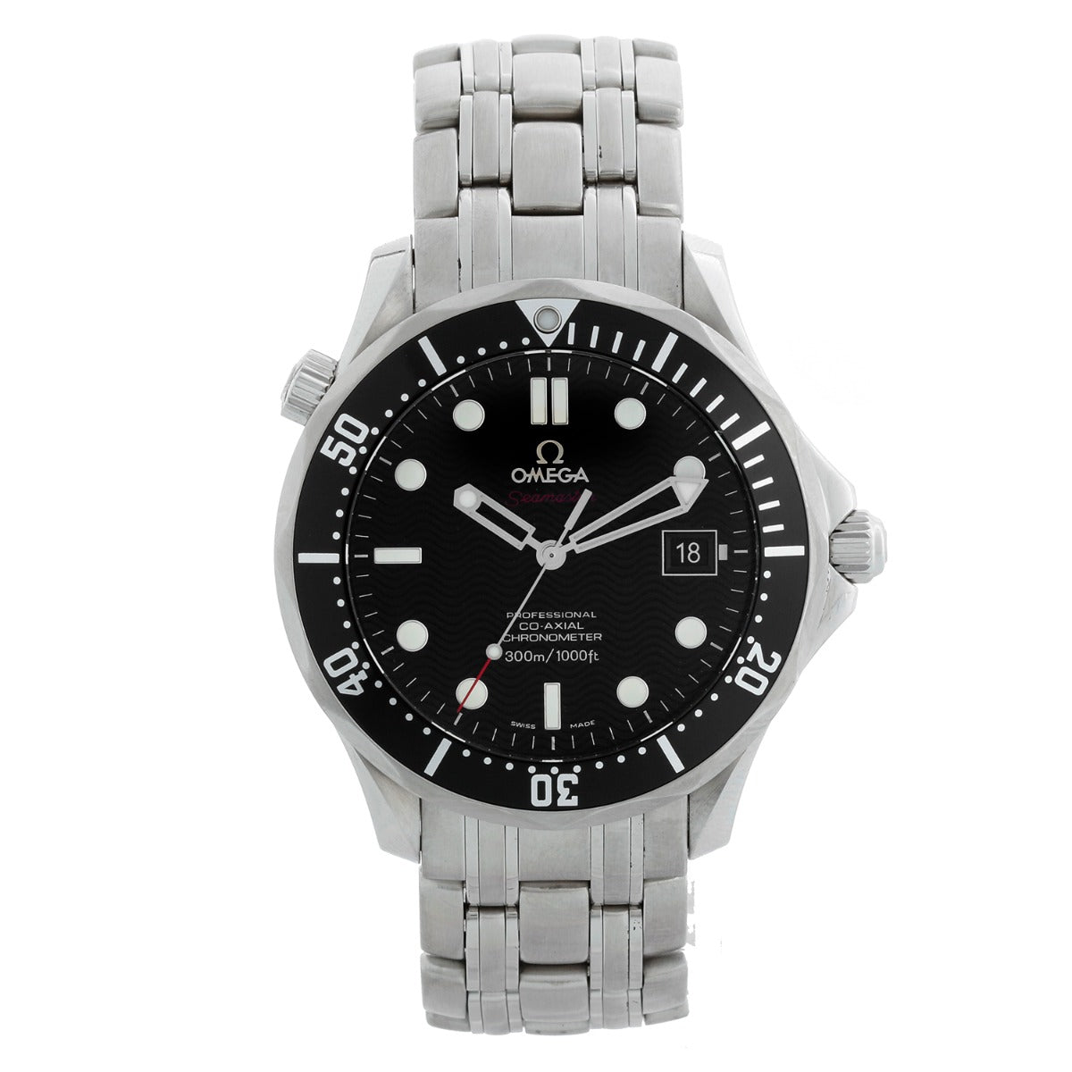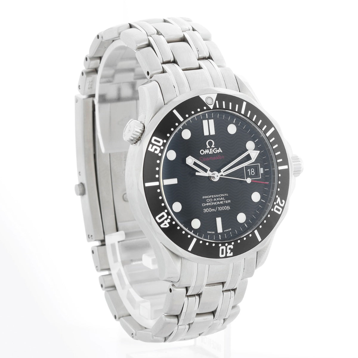 Omega Seamaster Diver 300M Men's Watch 212.30.41.20.01.002 - Co-Axial calibre 2500 self-winding chronometer. Stainless steel (41mm diameter). Domed, scratch‑resistant sapphire crystal with anti‑reflective treatment inside. Black unidirectional rotating bezel. Black dial decorated with a wave pattern and a date window at the 3 o’clock position.. Stainless steel bracelet will fit up to a 7.5 inch wrist . Pre-owned with custom box..