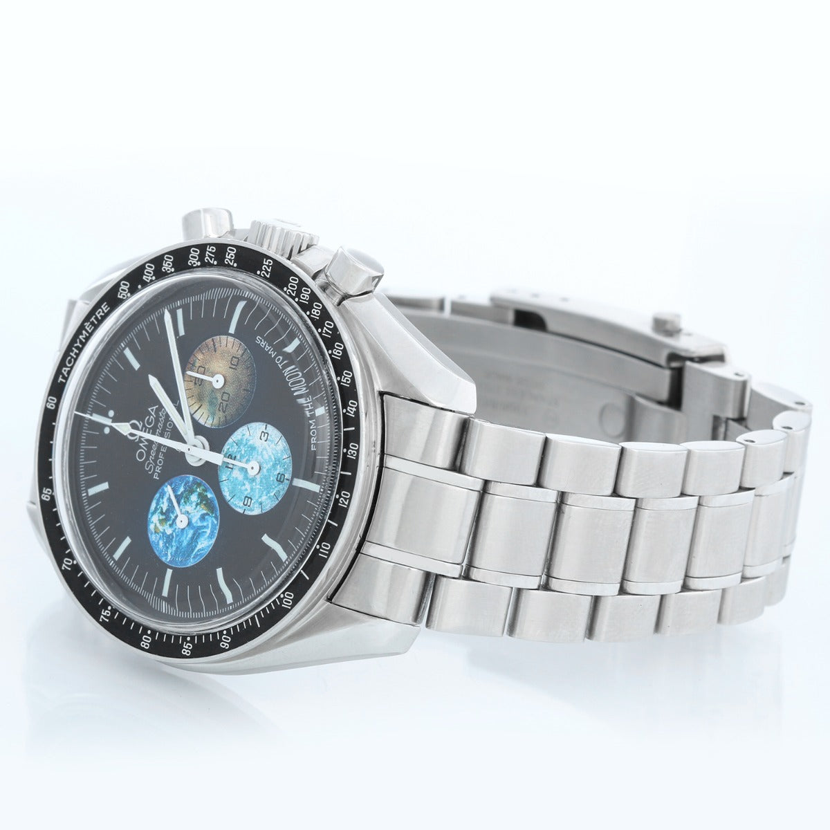 Omega Speedmaster "From Moon to Mars" Men's Watch 3577.50.00 - Manual Winding. Stainless steel case (42mm). Black dial with three subdials, earth, mars, and moon. Stainless steel bracelet; will fit a 7 3/4 inch wrist . Pre-owned with custom box.