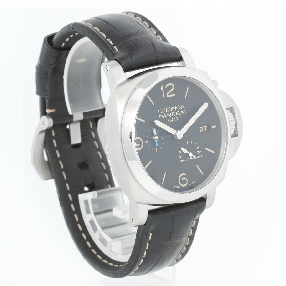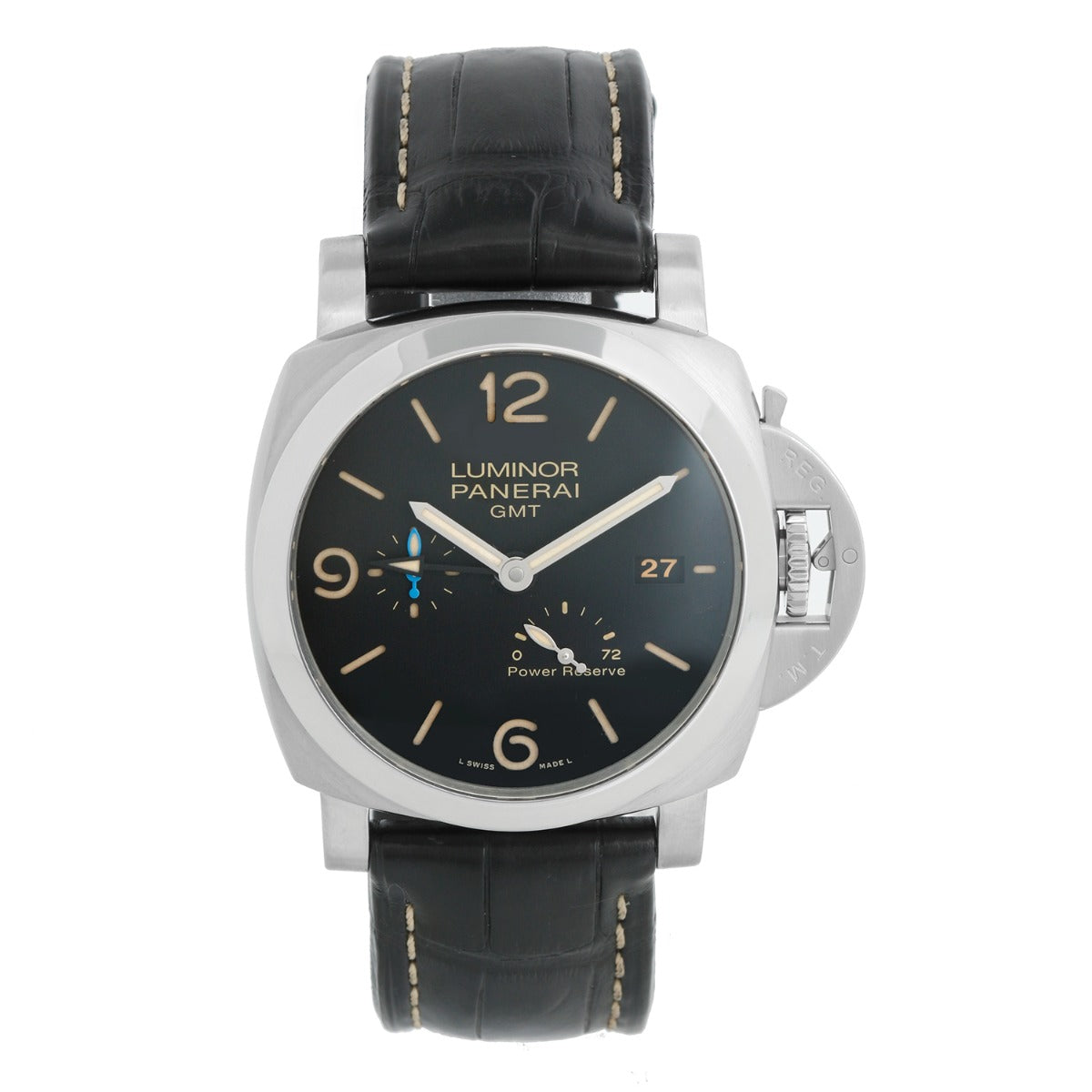 Panerai Luminor 1950 GMT 44mm Steel Mens Watch PAM01321 - Automatic. Stainless steel case ( 44 mm ). Black dial with luminous hands and index hour markers. Arabic numerals at 6, 9, and 12. Small seconds sub-dial located at the 9 o'clock position, 72 hour power reserve indicator. GMT/2nd Time Zone Indicated by the luminous tipped arrow-head hand. Date window at 3 o'clock.. Black Leather strap with Panerai stainless steel tang buckle. Pre-owned with Panerai box, book, and card. Not dated.