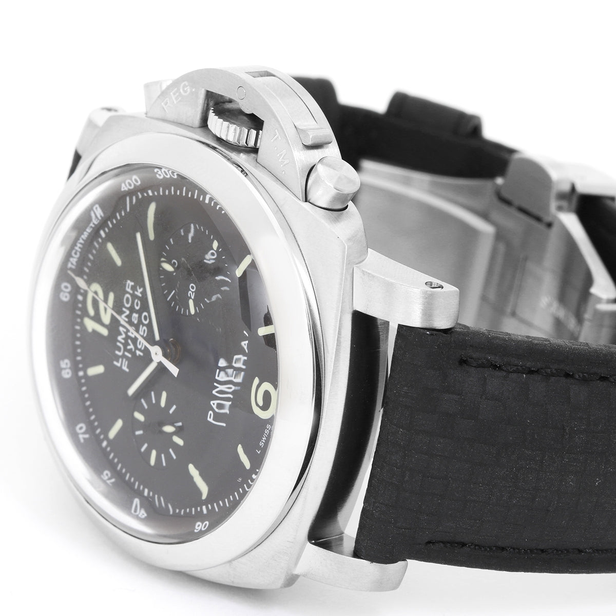 Panerai Luminor GMT 1950 Men's Stainless Steel Watch PAM 212 (PAM00212) - Automatic winding chronograph with flyback function. Stainless steel case with exposition back (44mm diameter). Black dial with luminous style markers and Arabic numerals and subseconds (44mm diameter). Black band stainless steel deployant buckle. Pre-owned with box.