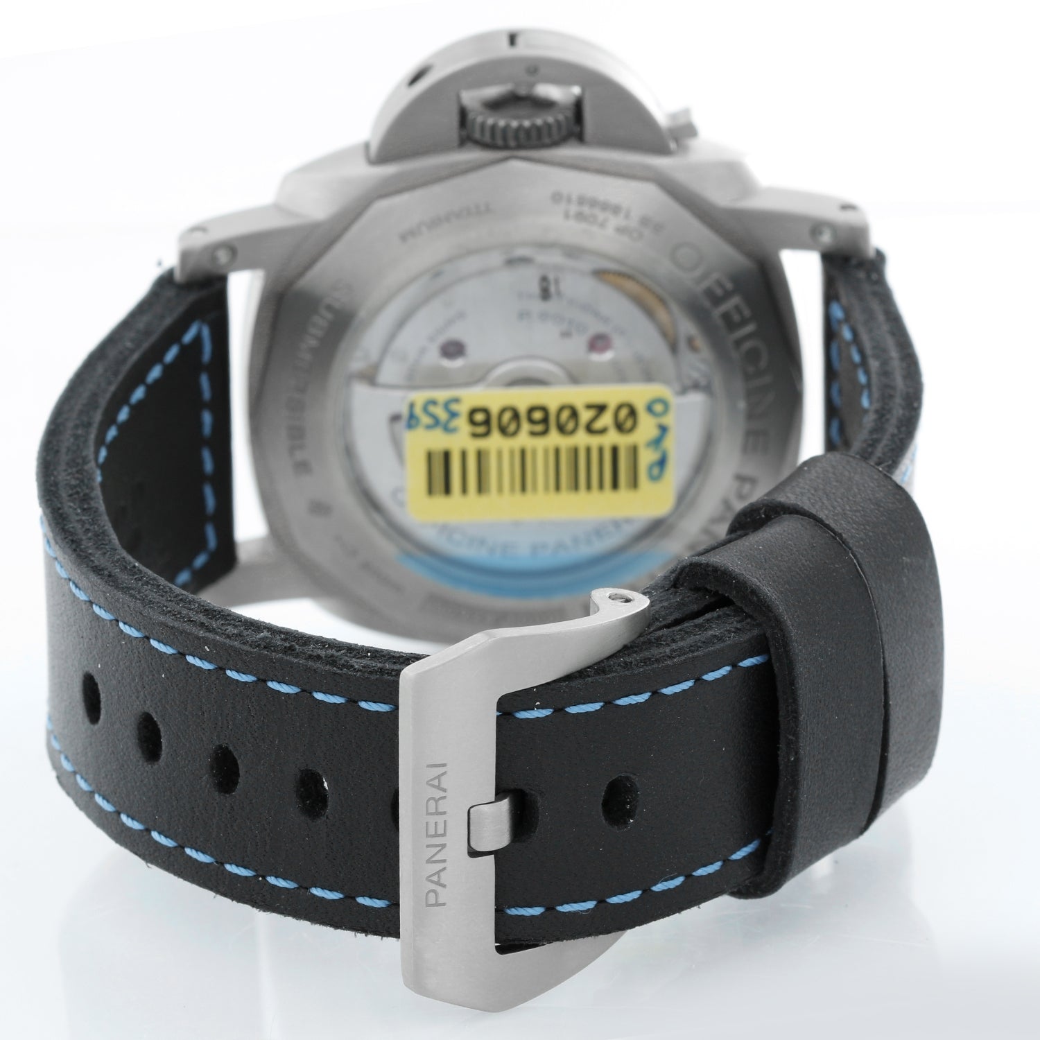 Panerai Luminor Submersible 1950 Men's Titanium Watch PAM 01305 - Automatic winding, subsecond dial, date at 3 o'clock. Titanium case with fixed Titanium bezel ( 47 mm ). Black dial with silver tone hands and dot hour markers. Black leather strap band with blue stitching with Panerai tang buckle. Pre-owned with Panerai box and books.