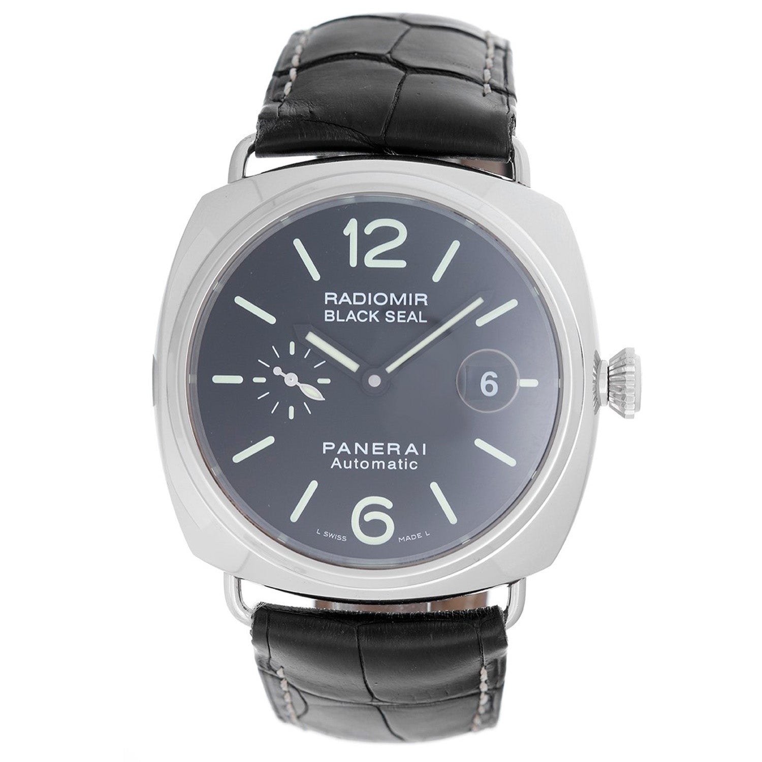 Panerai Radiomir Black Seal Men's Stainless Steel Watch PAM287 - Automatic winding. Stainless steel cushion style case (45mm). Black dial with Arabic numerals, stick markers with seconds subdial. Strap band with stainless steel Panerai deployant clasp. Pre-owned with custom box.