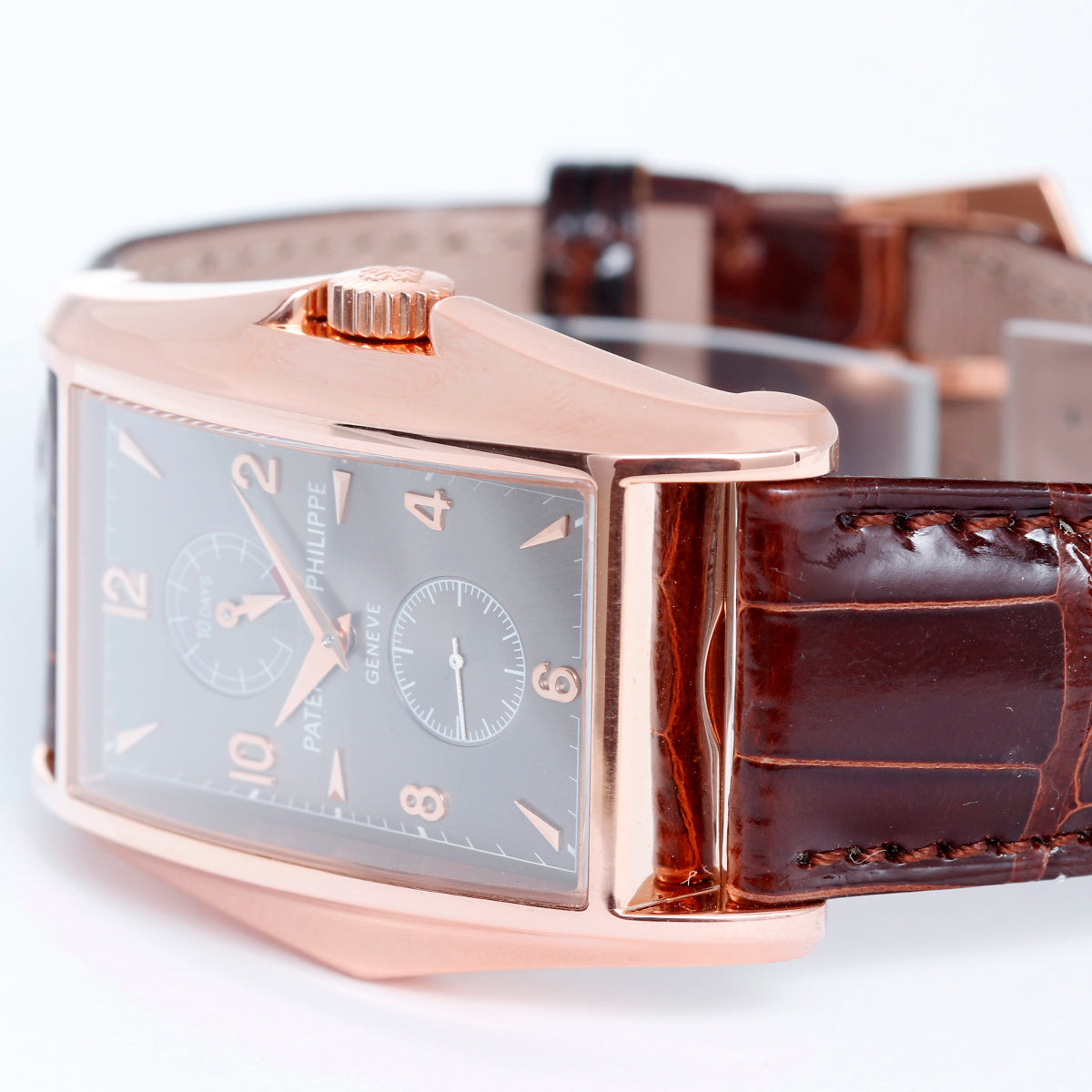 Patek Philippe 10-day Power Reserve Men's Rose Gold Watch Ref. 5100 R - Manual winding with 10-day power reserve indicator. 18k rose gold case with exposition back to view movement (34mm x 45mm). Gray dial with Arabic numerals and indices; subseconds and power reserve indicator. Strap band with 18k rose gold Patek Philippe buckle. Pre-owned with PP&Co. box and papers; Limited edition of only 750 pieces.