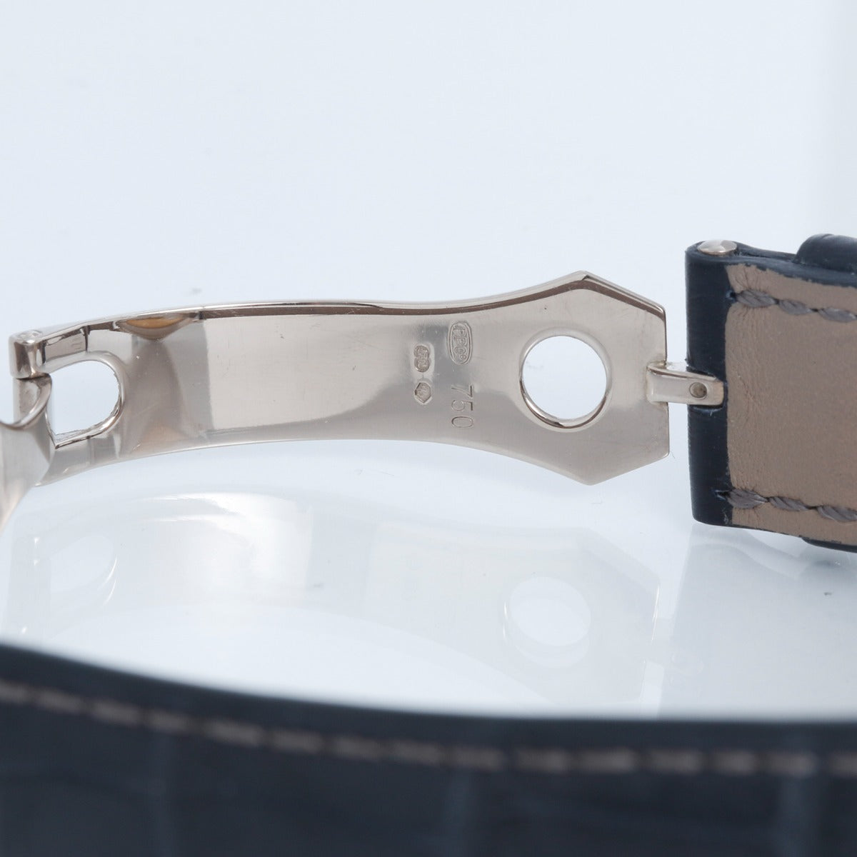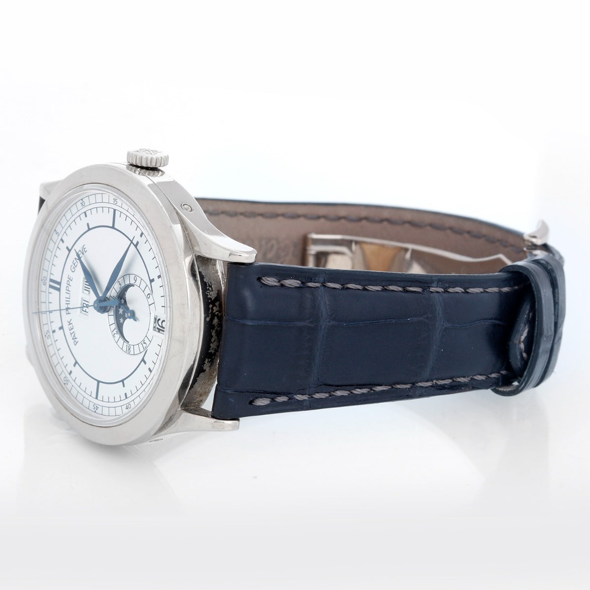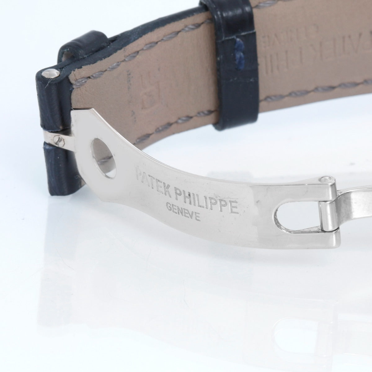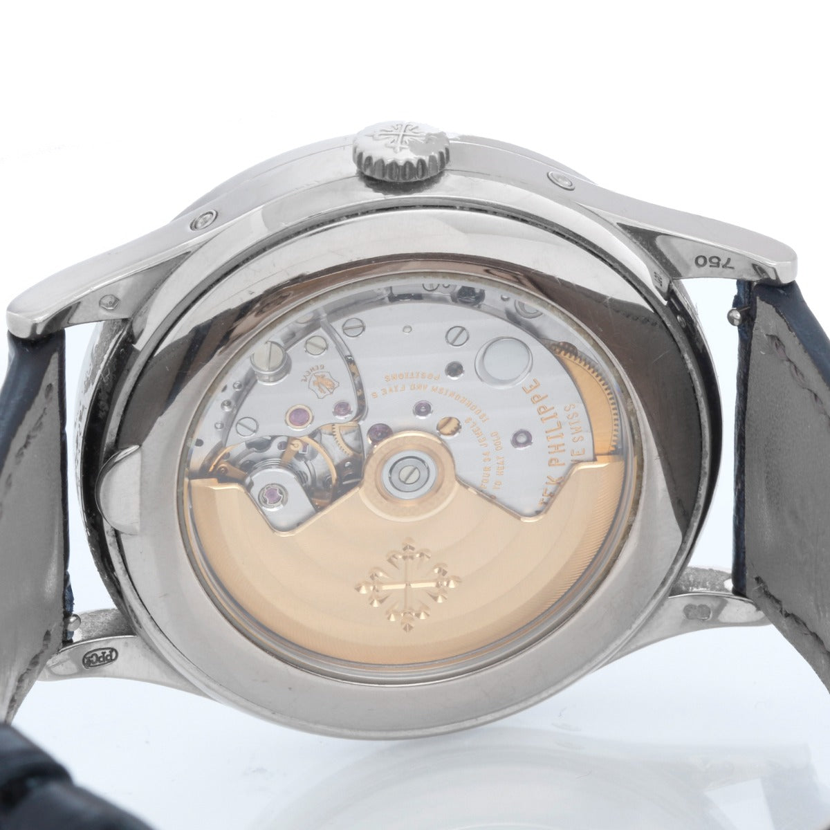 Patek Philippe Annual Calendar with Moon Phase 5396 G (or 5396G-001) - Automatic winding. 18k white gold case with exhibition back (38mm diameter). Silver dial with day, date, month and moonphase. Patek Philippe Blue strap band with 18k white gold Patek Philippe deployant clasp. Pre-owned with Patek Philippe box.