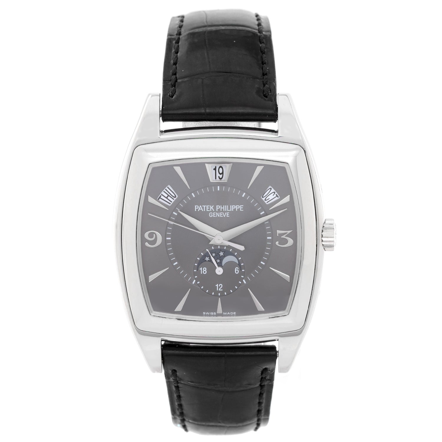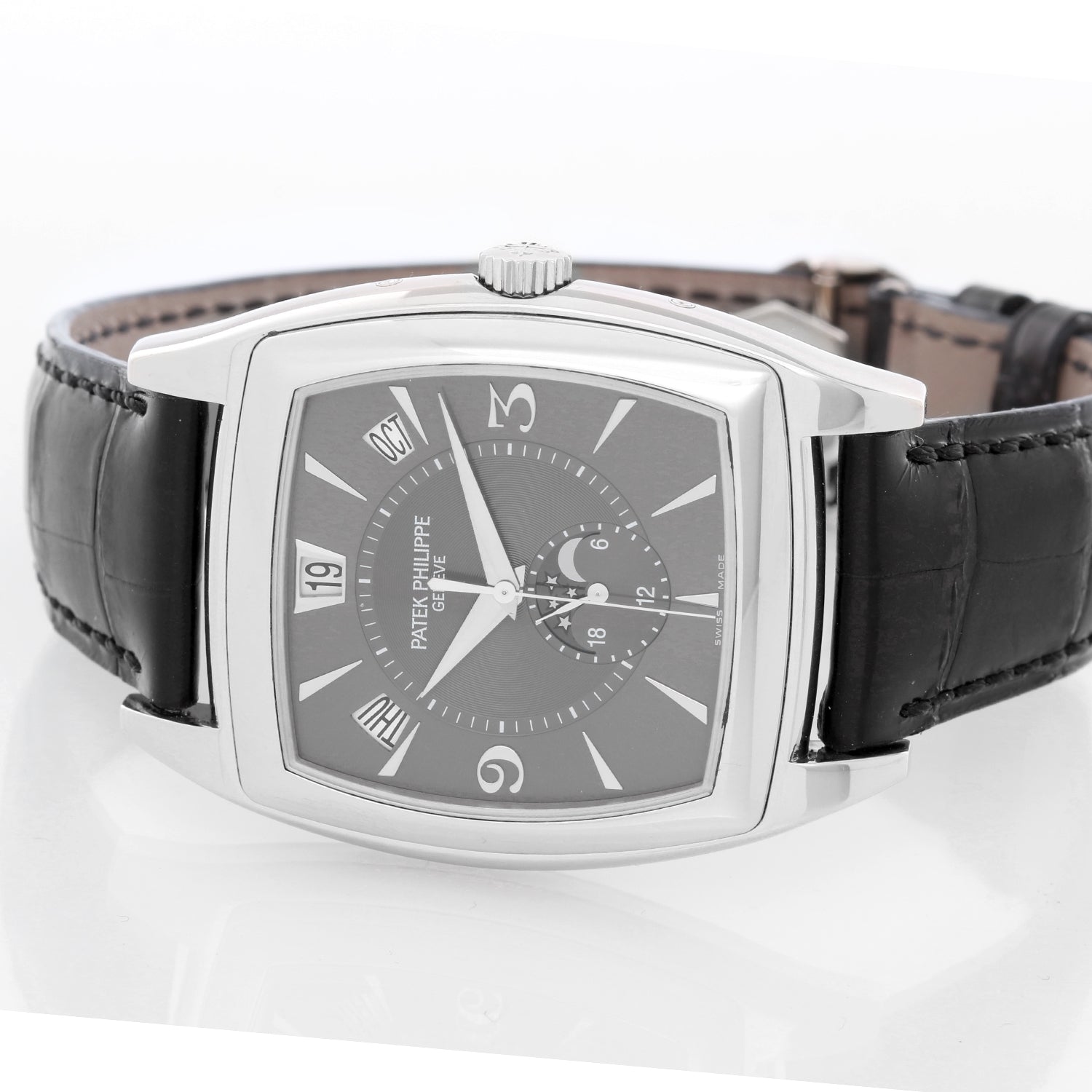 Patek Philippe Gondolo Calendario Annual Calendar 18k White Gold Men's Watch 5135/G (or 5135G) - Automatic winding. 18k white gold case with exposition back to view movement (38mm x 51mm). Two-tone silver and slate gray dial with Arabic numerals at 3 and 9 o'clock. Day, date, month, moonphase and a.m./p.m. indicators. Strap band with 18k white gold Patek Philippe buckle. Pre-owned with Patek Philippe box and papers.
