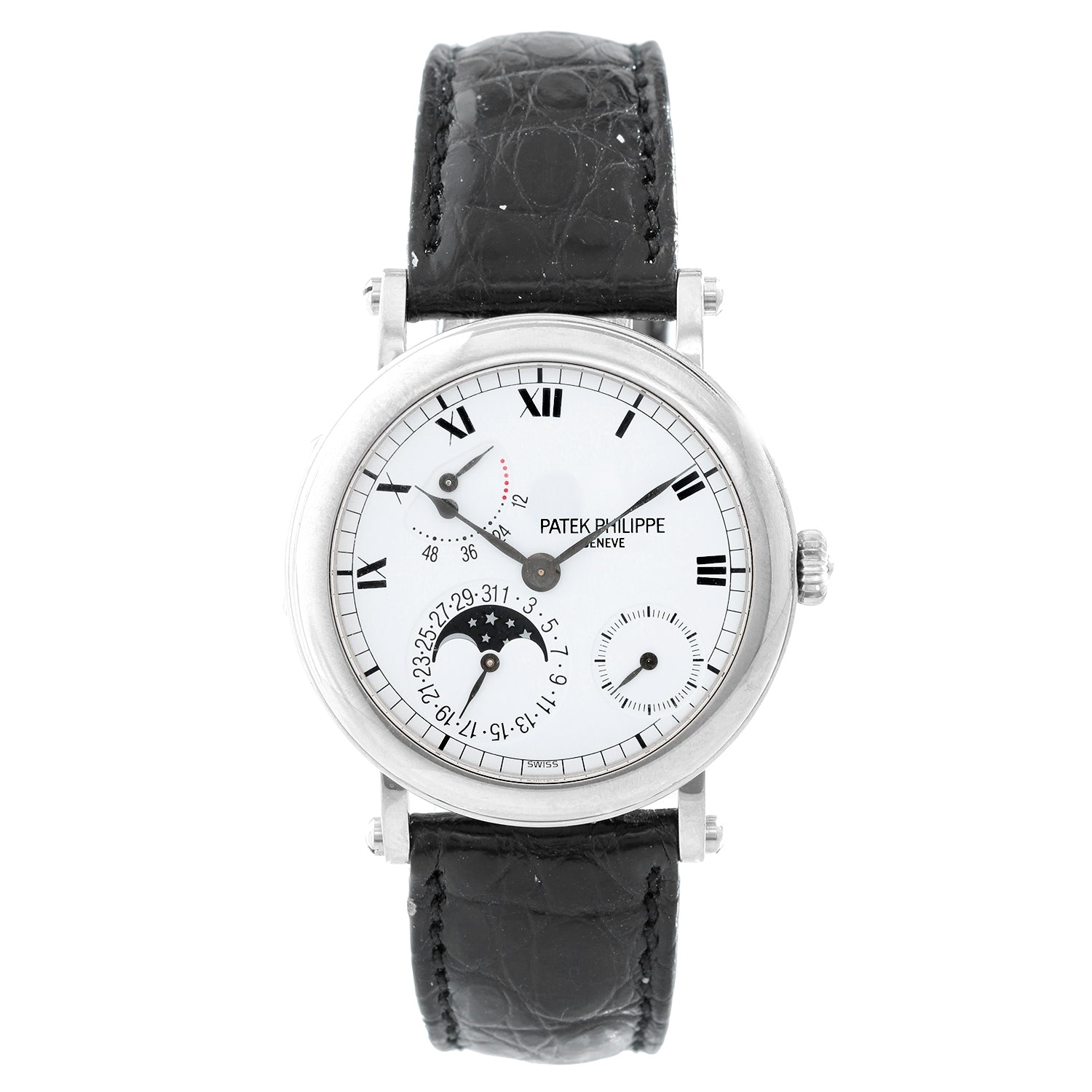 Patek Philippe Moonphase Calendar 18k White Gold Men's Watch 5054G-001 - Automatic winding. 18k white gold case with exposition back (35mm diameter). White dial with black Roman numerals; sub-seconds; date and moonphase; power reserve indicator. Black strap band with 18k white gold Patek Philippe buckle. Pre-owned with Patek Philippe & Co. and papers.