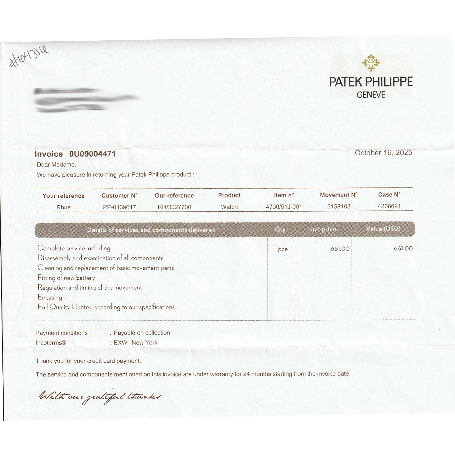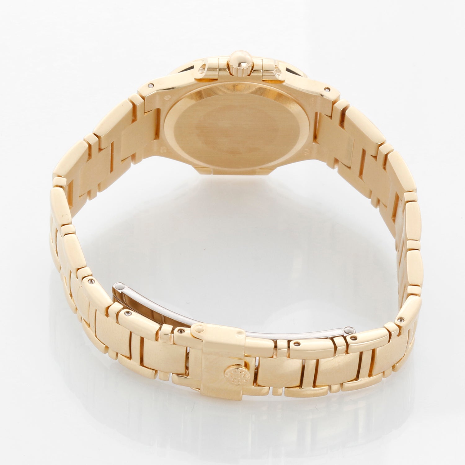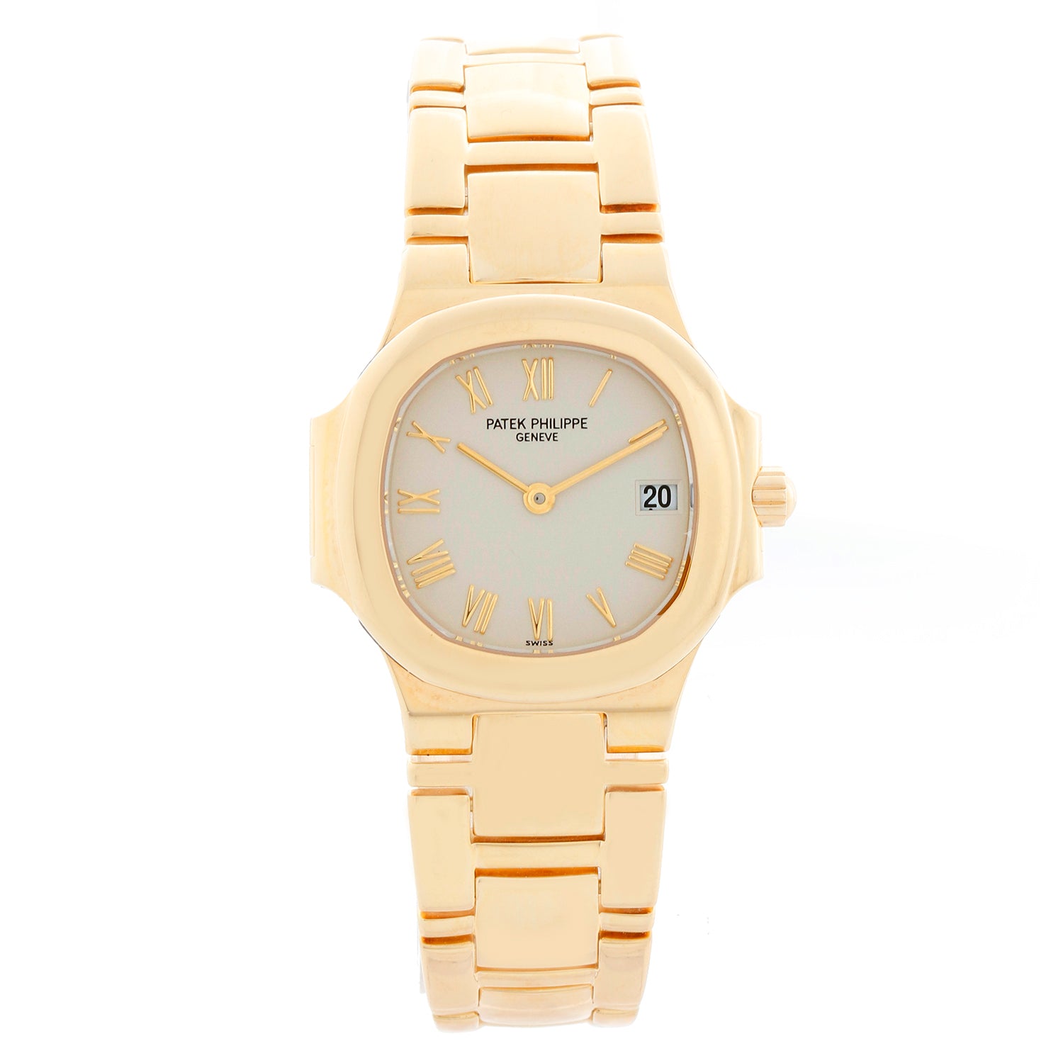 Patek Philippe Nautilus Ladies 18k Yellow Gold Watch Ref 4700/51J - Quartz. Nautilus. 18k yellow gold (26mm diameter). As some collectors prefer original finish we have left it as is but can be polished at customers request. Ivory dial with Roman hour markers; date at 3 o'clock position. 18k yellow gold Nautilus bracelet (will fit apx. 6-1/4-inch wrist) Additional links available. Pre-owned with Patek Philippe travel box. just returned from a full service at Patek Philippe.