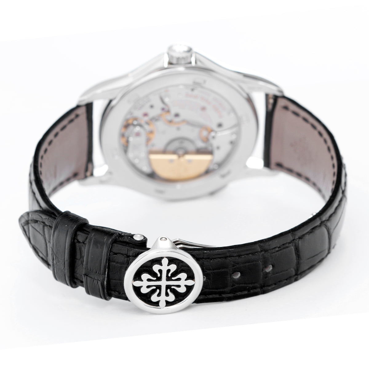 Patek Philippe World Time Men's Complicated Platinum Watch Ref 5110 P - Automatic winding with 24-hour time zone. Platinum round Patek Philippe case with exposition back to view movement (36mm diameter). Silver guilloche dial with white markers and silver and black 24-hour time zone dial. Strap band with platinum Patek Philippe deployant clasp. Pre-owned with box. Retail was $40,000.00, now discontinued and very collectible.