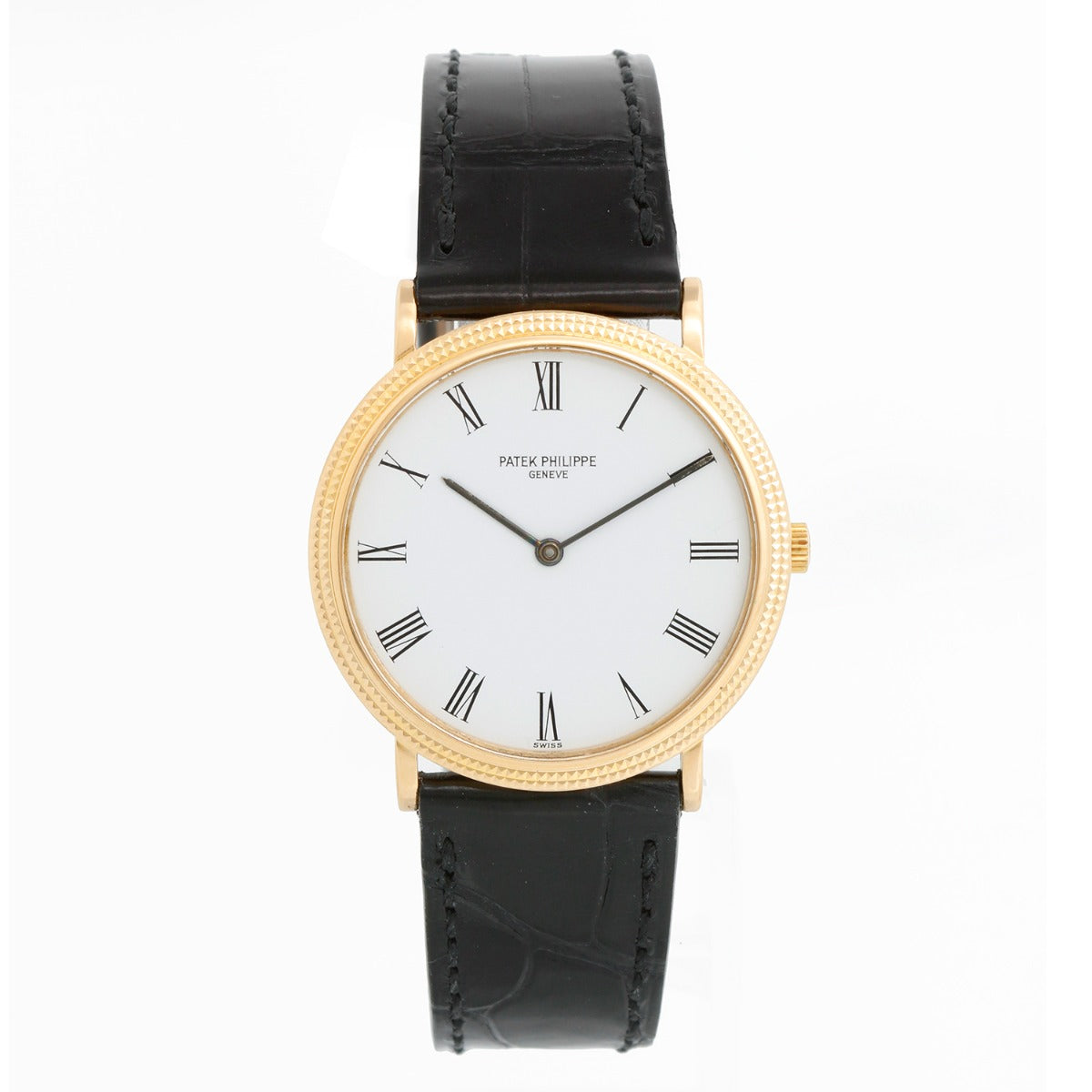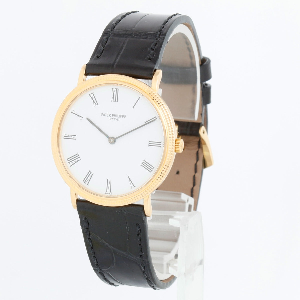 Patek Philippe Calatrava 18k Yellow Gold Men's Watch 3954 - Quartz . 18k yellow gold case with hobnail bezel (32mm diameter). White dial with roman numerals; dial has imperfections. Please refer to picture for it . Black Patek strap with Patek Philippe tang buckle. Pre-owned with Patek Travel Box.
