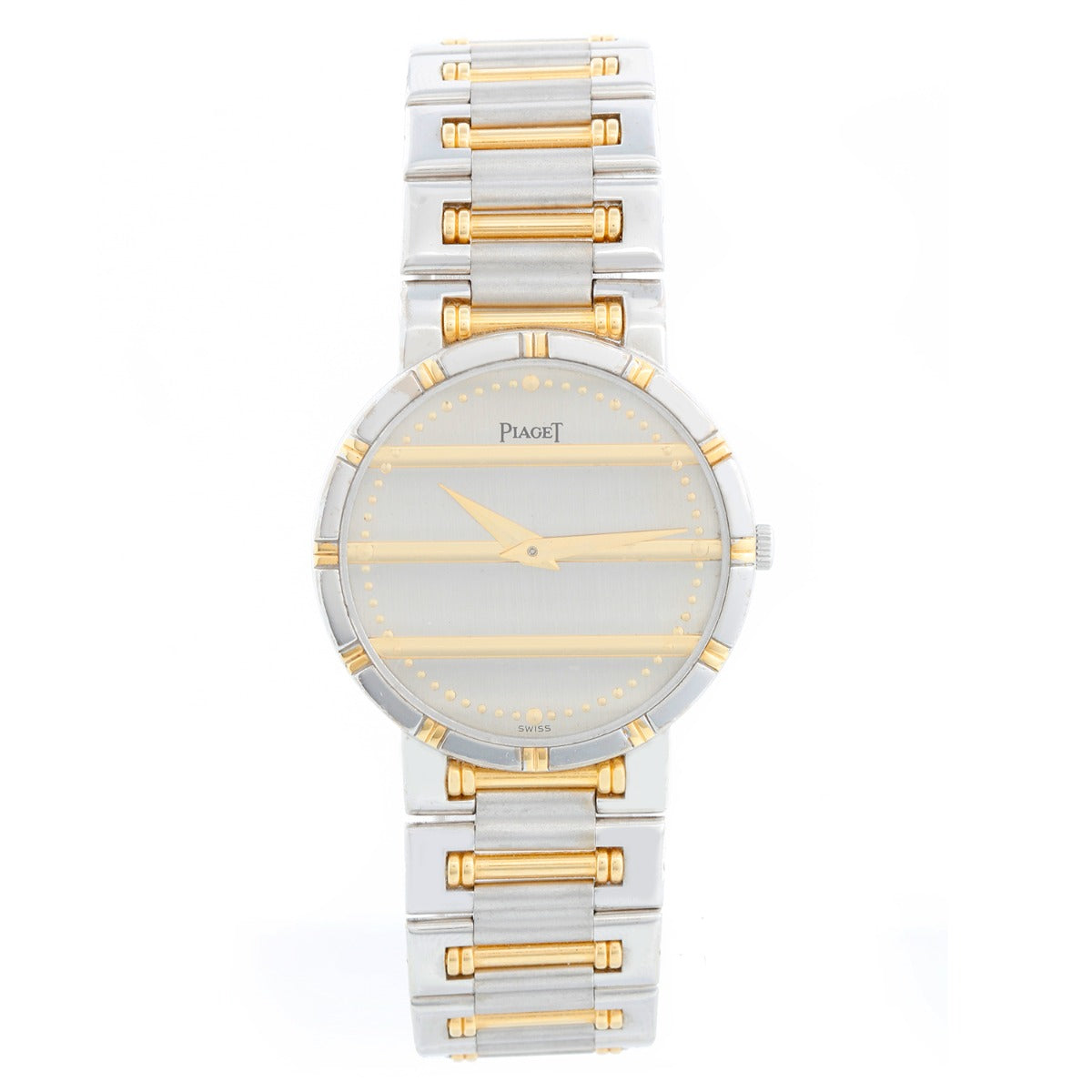 Piaget Dancer Men's 31mm 18k Yellow & White Gold Quartz Watch 84023 K81 - Quartz. 18k white gold case (31mm diameter). Silver dial with gold horizontal bars. 18k white gold bracelet with yellow gold links; will fit up to a 7.5 inch wrist. Pre-owned with custom box.