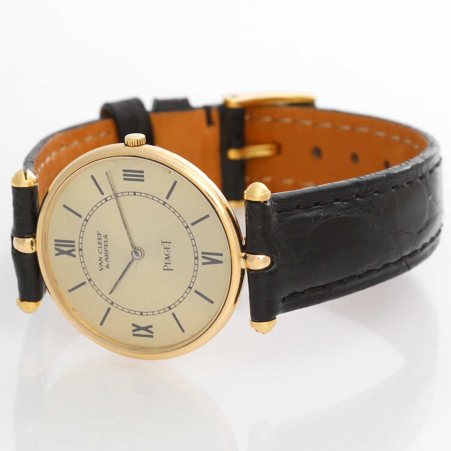 Piaget for Van Cleef & Arpels 18K Yellow Gold Ladies Watch - Manual winding . 18K Yellow gold ( 30 mm ) . Silvered champagne dial with stick and roman numerals. Both Van Cleef & Arpels and Piaget logos on dial . Black alligator strap with tang buckle . Pre-owned with custom box .