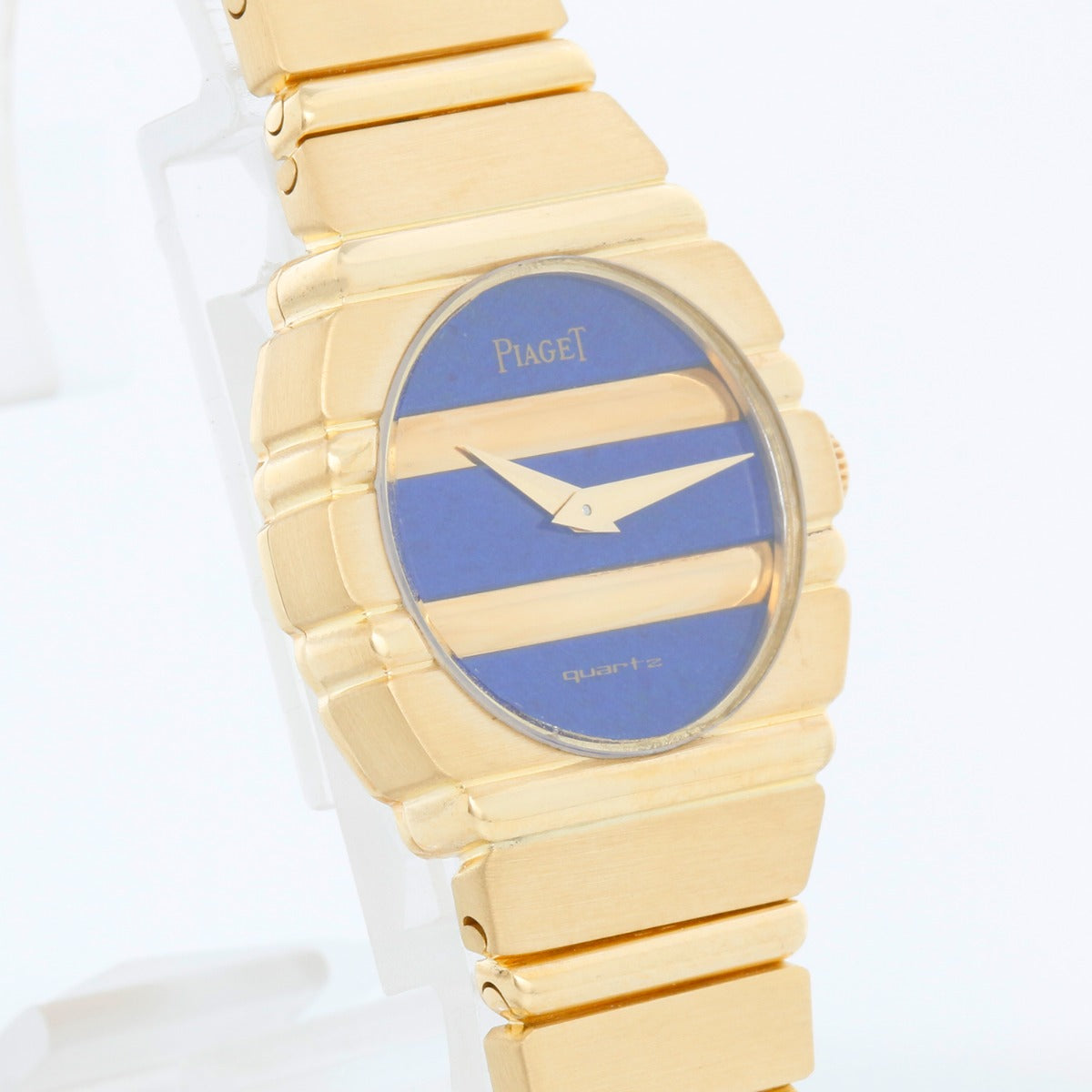 Piaget Polo 18K Yellow Gold Ladies Lapis Lazuli Watch 861 C 701 - Quartz. 18K Yellow Gold ( 25 x 25 mm ). Lapis Lazuli dial. 18K Yellow Gold bracelet; measures up to a 6 inch wrist. Pre-owned custom box.