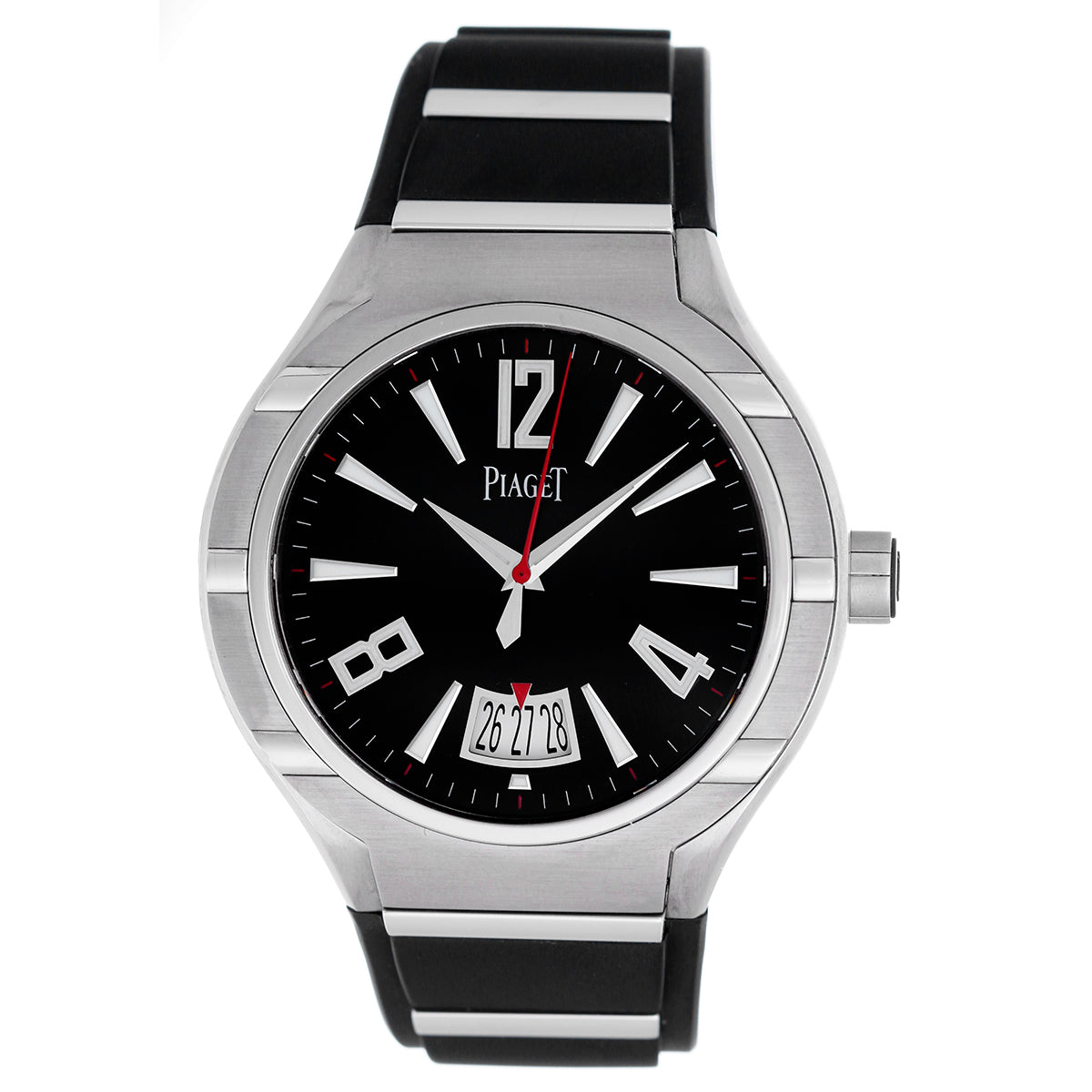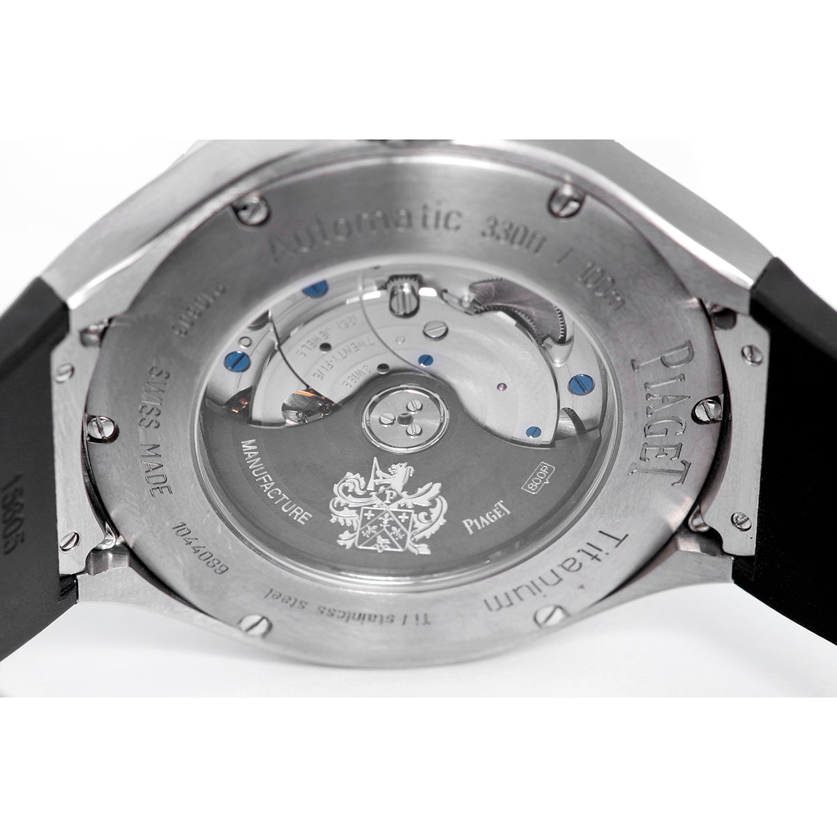Piaget Polo FortyFive Watch G0A34011 - Quartz. Stainless steel and Titanium case (45mm diameter) . Exposition case back. Black dial with date at 6 o'clock. Rubber strap with Piaget deployant clasp. Pre-owned with Piaget box.