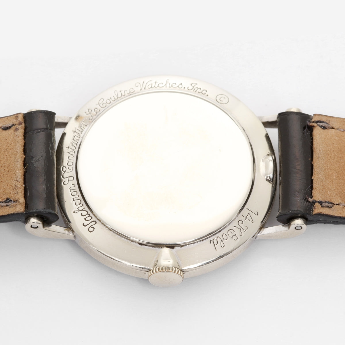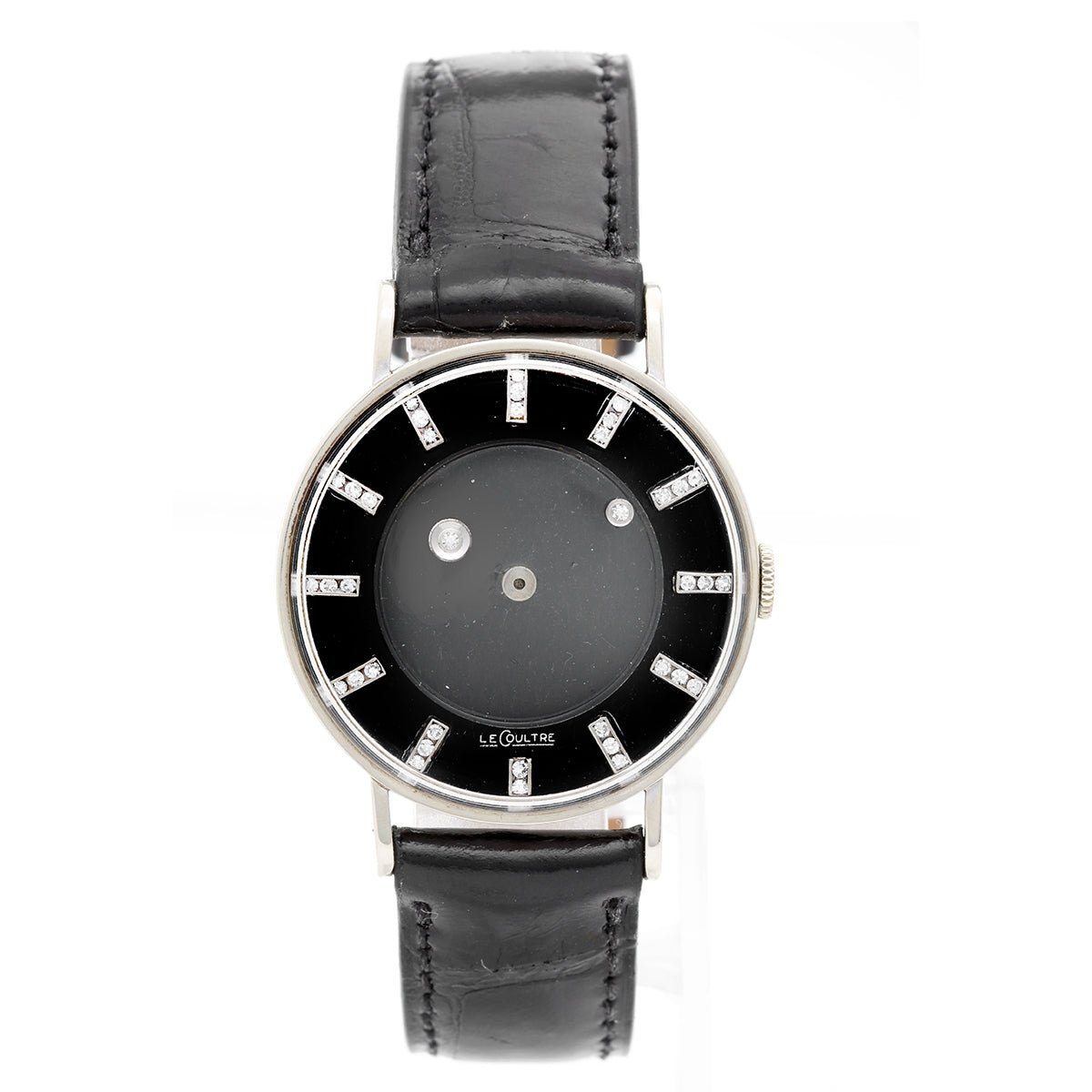 Rare Men's Jaeger-LeCoultre Mystery 14k Galaxy Watch - Manual winding. 14k white gold case (33mm diameter). Black dial with each hour marker having 3 diamonds; single diamond hour and minute markers appear unattached. Case back marked "Vacheron & Constantin - LeCoutre Watches , Inc.". Black strap band. Pre-owned/vintage, ca. 1950, with custom box; very collectible and difficult to find.