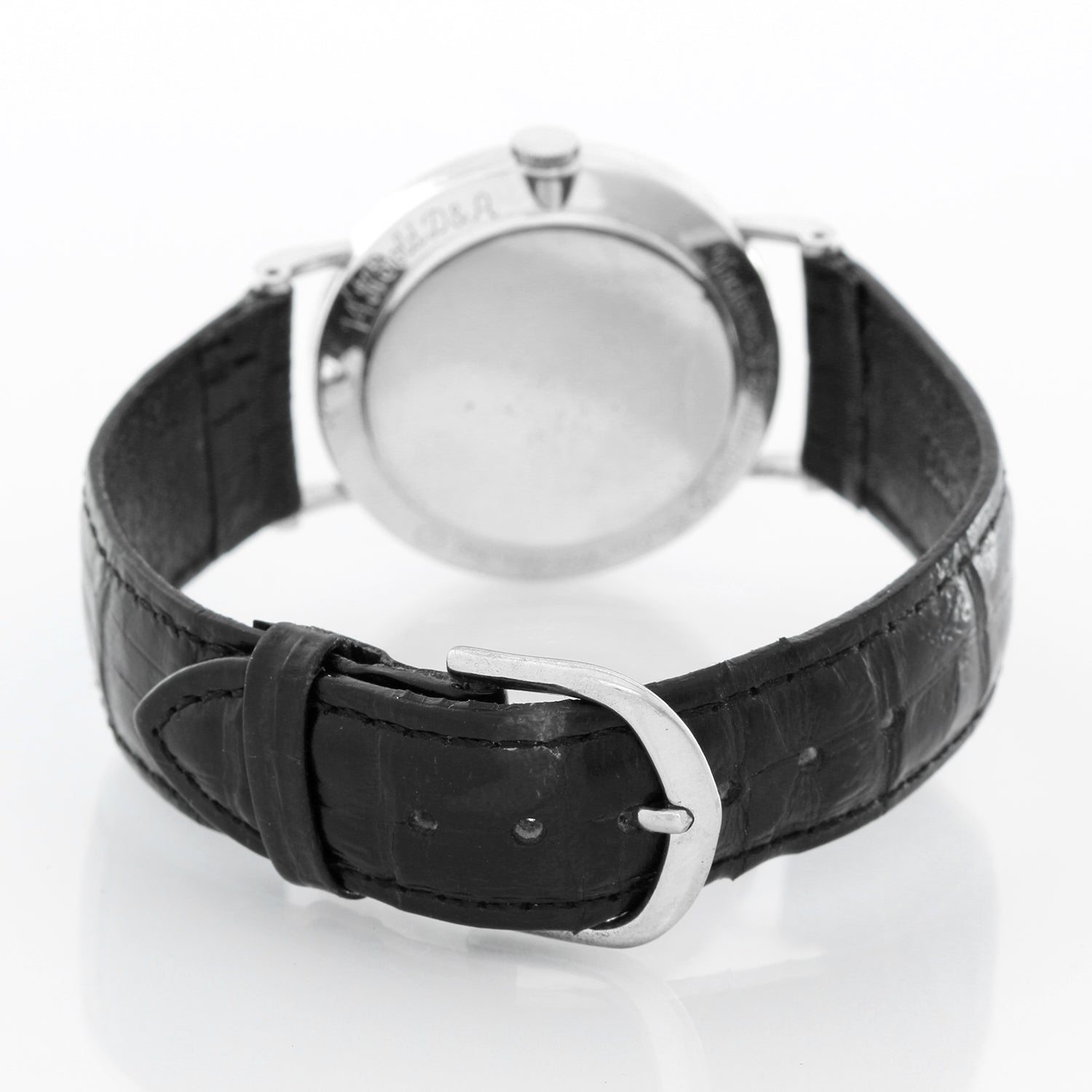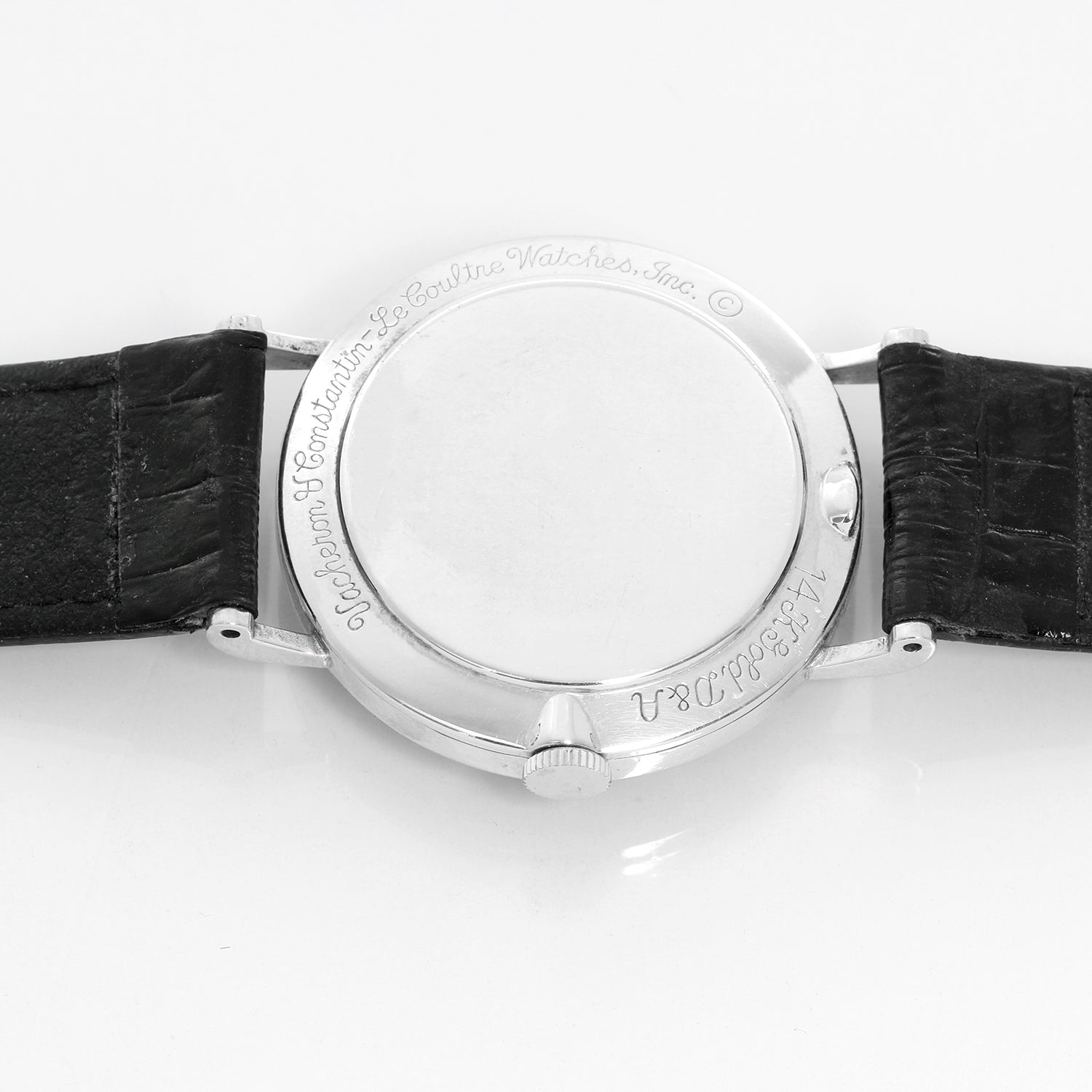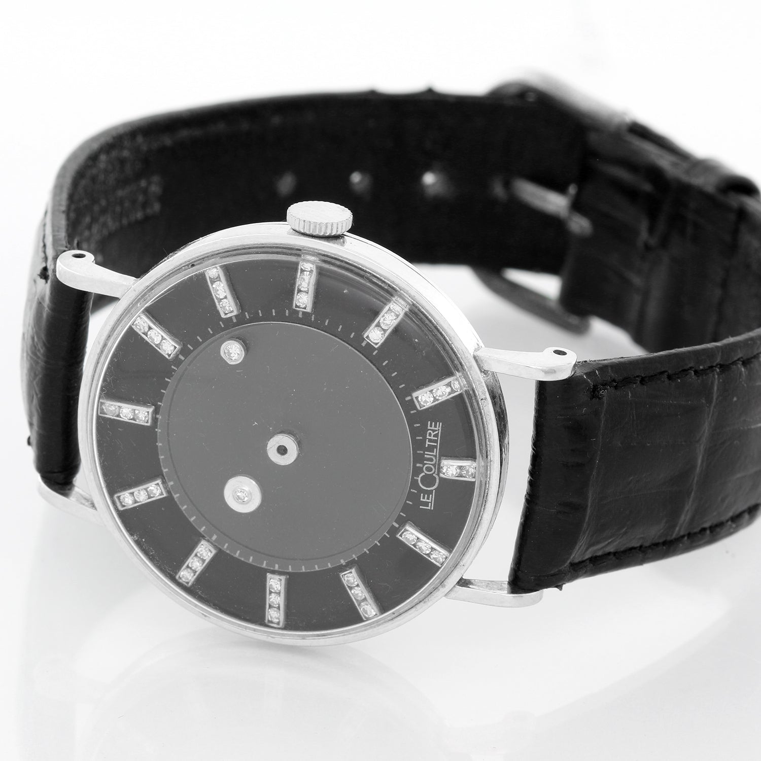 Rare Men's Jaeger-LeCoultre Mystery 14k Galaxy Watch - Manual winding. 14k white gold case (33mm diameter). Black dial with each hour marker having 3 diamonds; single diamond hour and minute markers appear unattached. Case back marked "Vacheron & Constantin - LeCoutre Watches , Inc.". Black strap band. Pre-owned/vintage, ca. 1950, with custom box; very collectible and difficult to find.