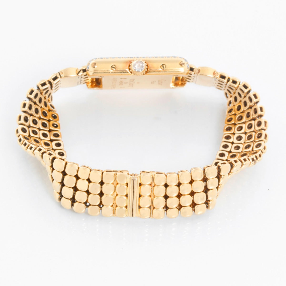 Rare & Unusual Cartier 18K Yellow Gold Tank Ladies Watch 8057 - Quartz. Factory 18K yellow gold with pave diamond case ( 18 x 25mm ). Silver tone dial with black roman numerals. Ball link style bracelet with double row bar of diamonds across each side and deployant clasp; will fit a 6 inch wrist. Pre-owned with Cartier box/missing cuff